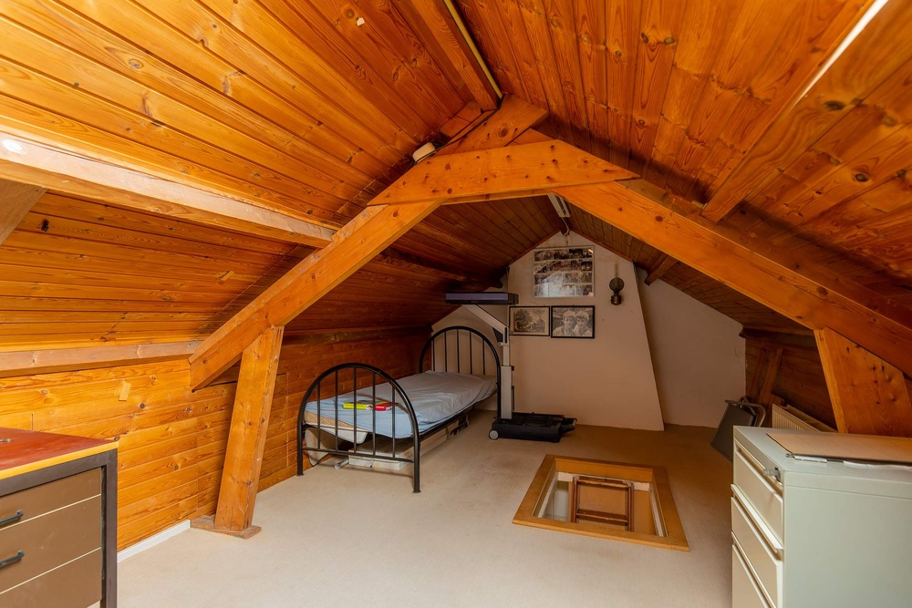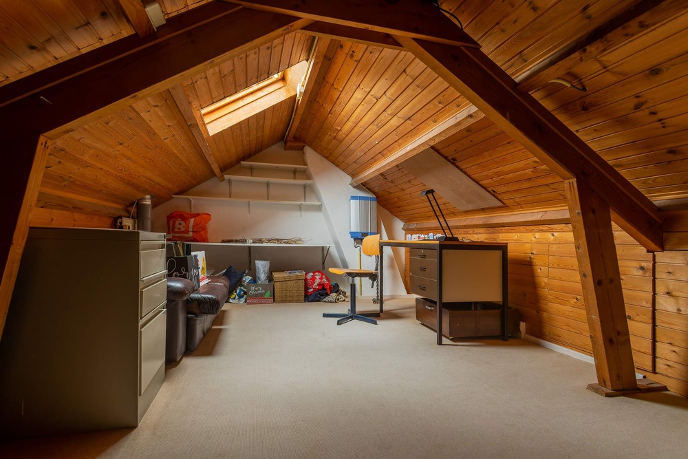 Zolderverdieping: bereikbaar middels een houten trapje.Open zolderruimte (ca. 12 m2) met nokbalk op 2,05 meter, dakraam, knieschotten en de omvormer van de zonnepanelen.