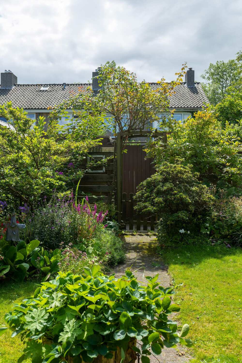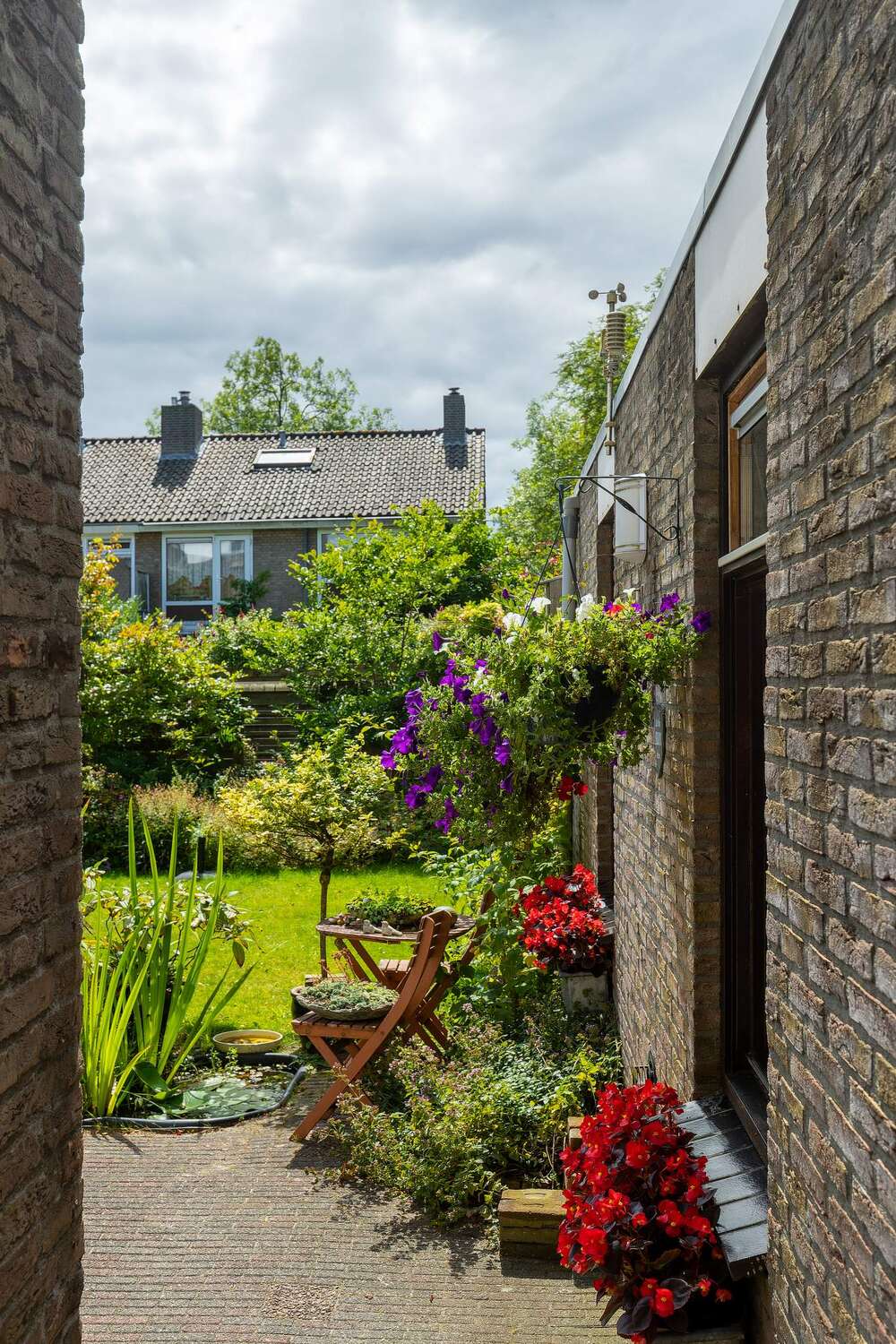 Voortuintje.Royale achtertuin (ca. 140 m2 op het zonnige zuiden) met terras, borders en de vrijstaande stenen garage (in spouw gebouwd, ca. 25 m2, voorzien van elektra, gasaansluiting en water).Voor de garage een oprit/parkeerplaats.