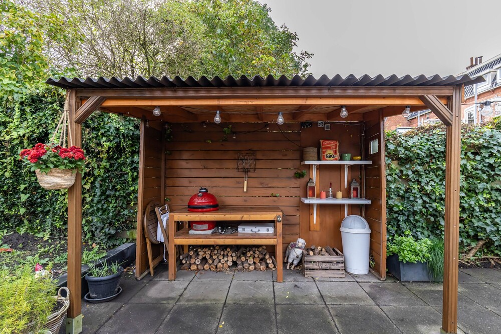 Tuin: naast de uitbouw (ca. 15 m2) en achter de slaapkamer nog eens 52 m2. De tuin is volop genieten: georiënteerd op zuidoosten ('s zomers de gehele dag in de zon) en met een gezellig terras, borders en een veranda. De achterliggende bebouwing ligt op ruime afstand, waardoor je voldoende gevoel van privacy ervaart.