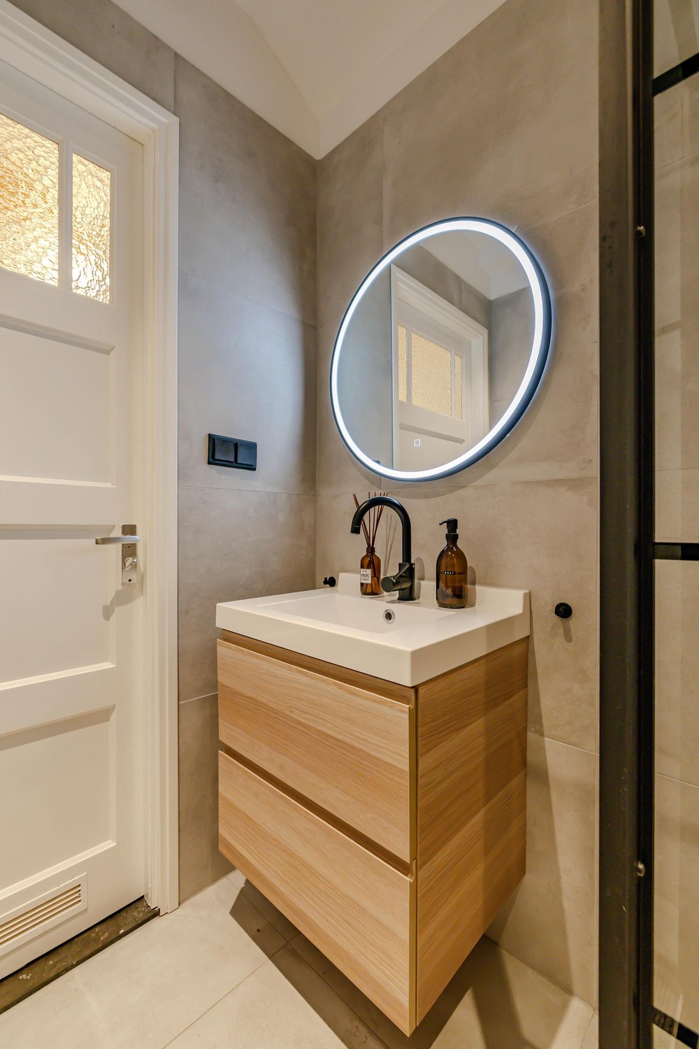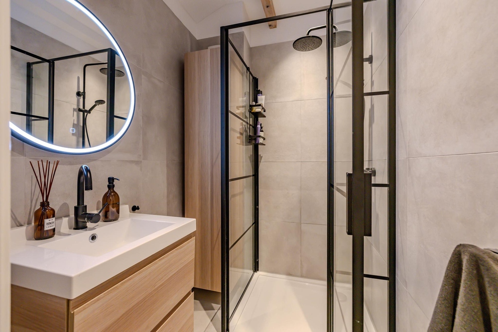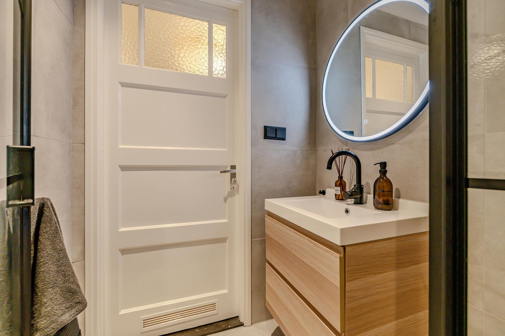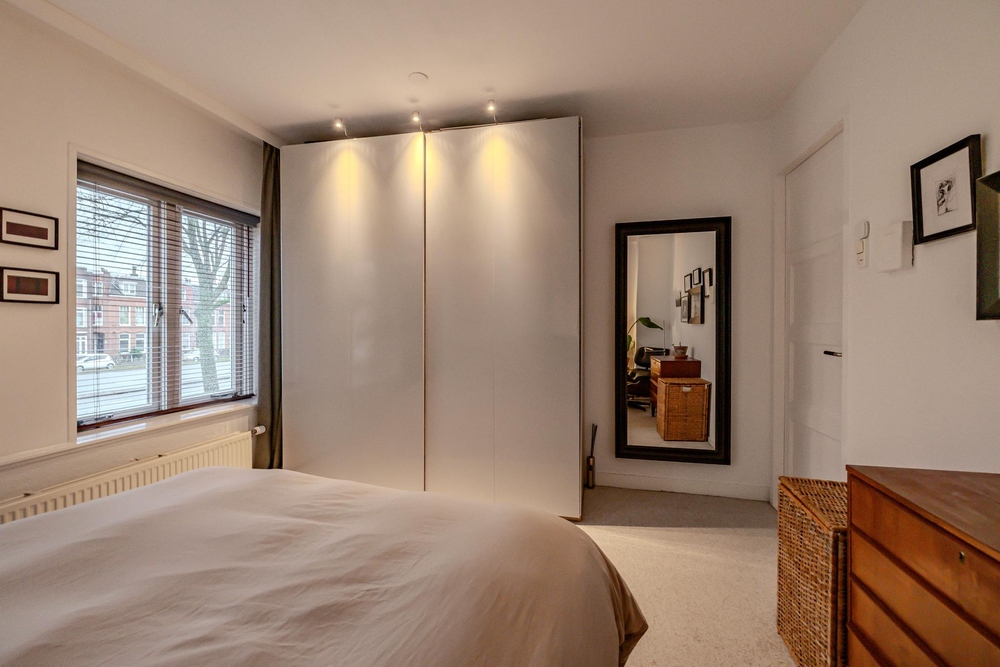 Eerste verdieping: Overloop met toegang tot alle vertrekken,Fraaie slaapkamer aan de voorzijde (ca. 14 m²) met leuke uitstekende erker. Tweede slaapkamer aan de achterzijde (ca. 8 m2) met bergruimte achter knieschottenModerne (2021) en luxe badkamer (ca. 3 m2) met inloopdouche en badmeubel.