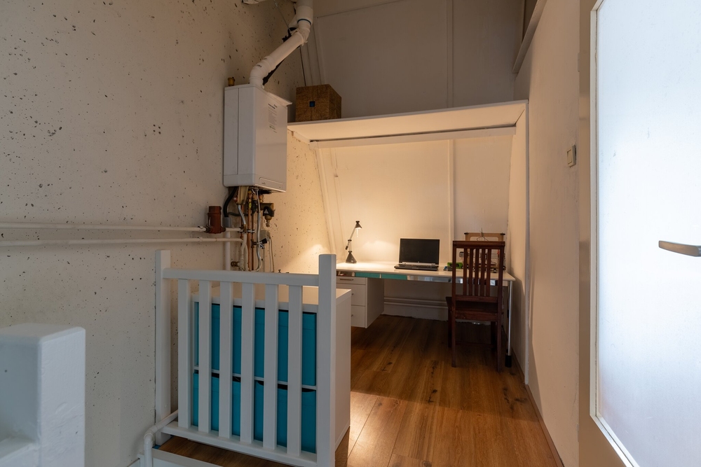 Tweede verdieping: ruime overloop met veel bergruimte van ca. 11 m² en toegang tot twee slaapkamers. Aan de voorzijde is een slaapkamer van ca. 9 m² met een groot dakraam. Aan de achterzijde bevindt zich een slaapkamer van ca. 11 m² voorzien van een groot dakkapel.