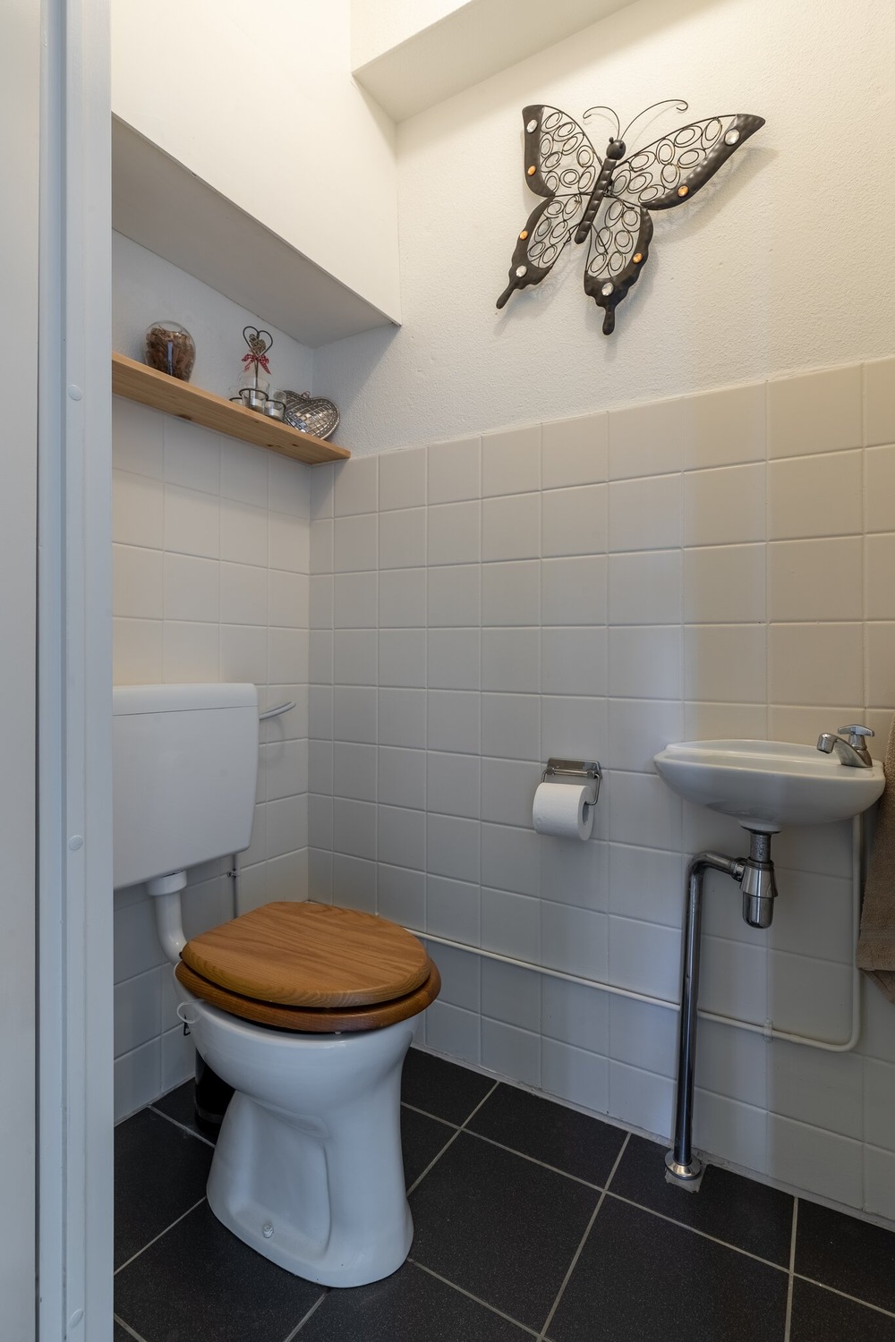Eerste verdieping: overloop met toegang tot drie slaapkamers en een badkamer. De grote slaapkamer is ca. 16 m² en is voorzien van een groot dakraam. De overige twee slaapkamers zijn ca. 12 m² en 7 m². De badkamer van ca. 6 m² beschikt over een ligbad met douche, wastafel en toilet. Tevens is hier een aansluiting aanwezig voor de wasmachine.
