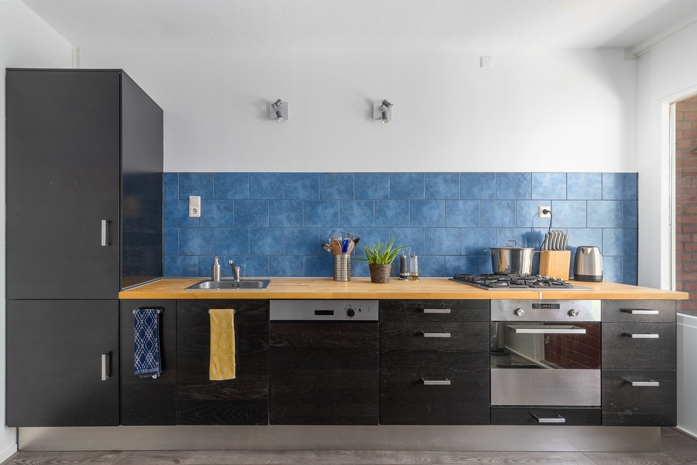 Verdieping: entree met toegang tot de woonkamer en één slaapkamer van ca. 12 m², een lichte woonkamer van ca. 24 m² met doorgang naar de half open keuken van ca. 12 m² (v.v. vaatwasser, oven, 4-pits gaskookplaat, koelkast en vrieskast), balkon van ca. 7 m², hal met toegang tot twee slaapkamers van ca. 14 m² en 9 m², een badkamer van ca. 5 m² (v.v. inloopdouche, wastafelmeubel en wasmachineaansluiting), afzonderlijk toilet en een opbergkast.