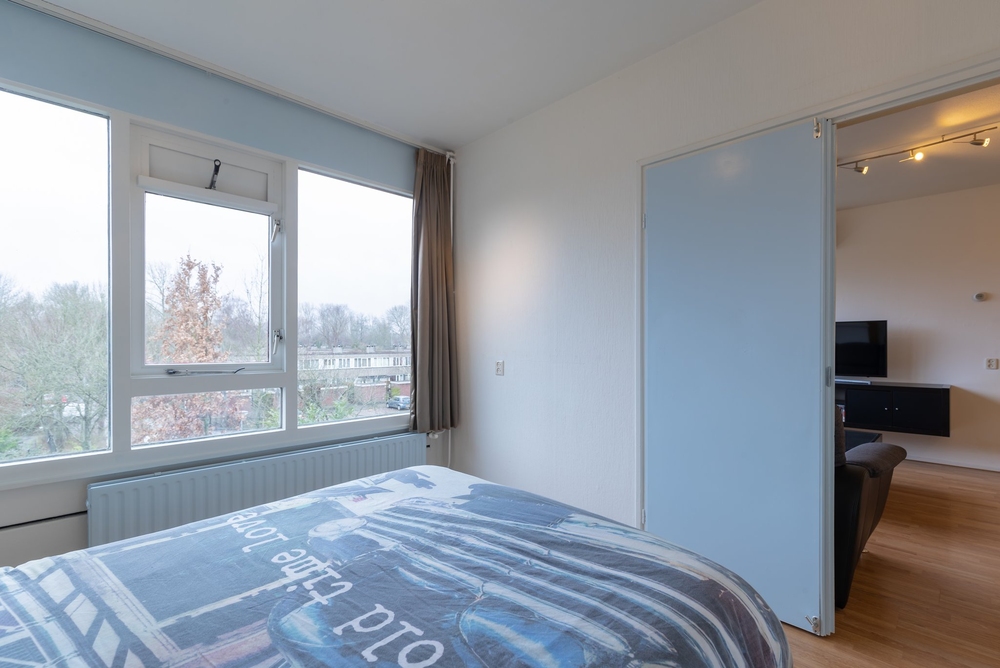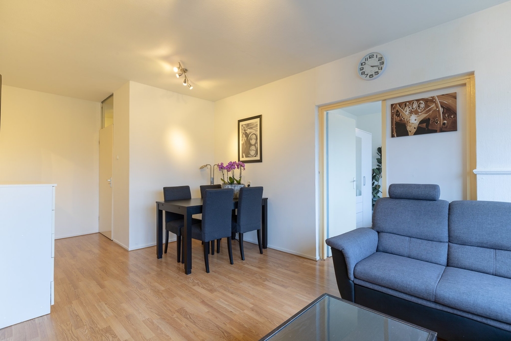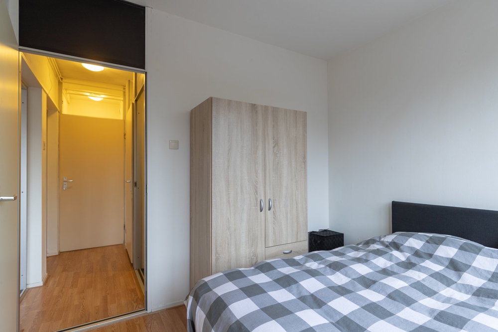 Centrale hal/portiek met trappenhuis.Entree/hal: met toegang tot de woonkamer en eerste slaapkamer.L-vormige woonkamer van ca. 22 m2, met airco en laminaatvloer. Deur slaapkamer achterzijde, keuken en naar een tweede tussenhal.Ruime woonkeuken (ca. 13 m2) , eenvoudig ingericht met vaste kast v.v. CV ketel (HR, eigendom 2006) en deur naar balkon op zuid (ca. 3 m2). Tussenhal met toegang tot toilet, eenvoudige badkamer, inloopkast met opstelplaats voor de wasmachine.Badkamer (ca. 4 m2) met douche en vaste wastafel.Twee slaapkamers aan de voorzijde van ca. 9 en 14 m2.Slaapkamer achterzijde (ca. 12 m2), met doorloop naar de woonkamer.