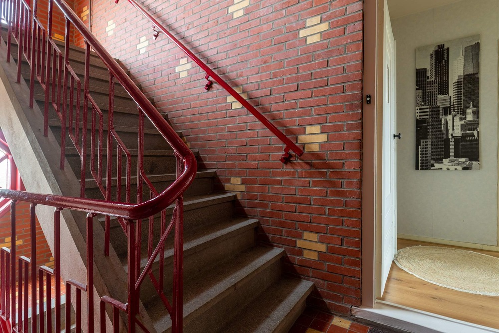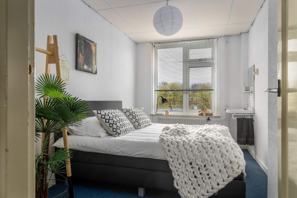 Tweede verdieping: entree, hal met toiletruimte en toegang tot de ruime en lichte L-vormige woonkamer van circa 39 m2. Aan de voorzijde vrij uitzicht over de sluizen van het Van Starkenborghkanaal en aan de achterzijde toegang tot het balkon op het westen met middag- en avondzon. Tussenhal met toegang tot beide slaapkamers van circa 9 en 11 m2. De kleinste slaapkamer heeft een balkon aan de voorzijde met ochtendzon. Eenvoudige dichte keuken (8 m2) Via de keuken is tevens het achtergelegen balkon (5 m2) te bereiken. Compacte badkamer (2 m2) met douche en een wastafel.