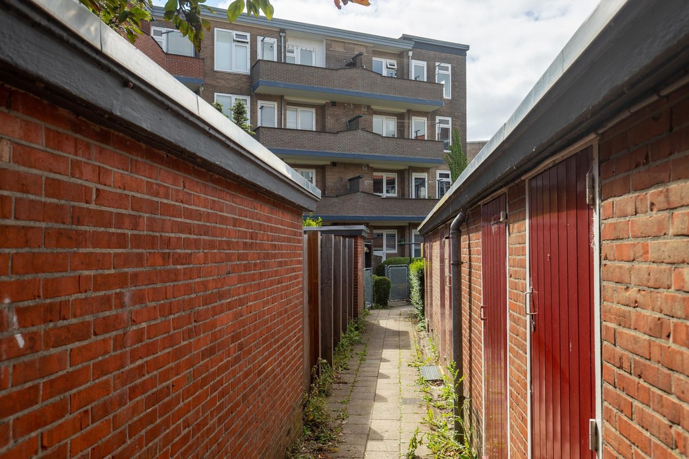 Begane grond: gesloten portiek met intercom en trapopgang naar de appartementen. Aan de achterzijde van het complex bevinden zich de stenen bergingen van de appartementen.