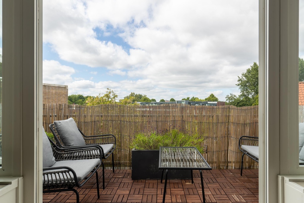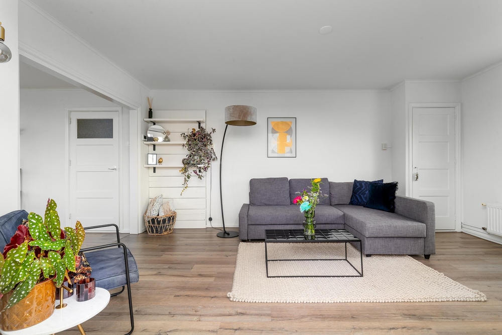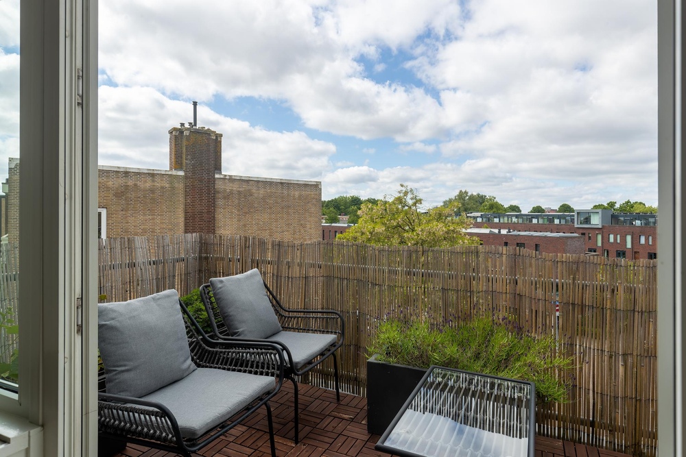 Vierde woonlaag: entree/hal met toilet en meterkast. Door de hoekligging zijn er veel raampartijen die zorgen voor een prettige lichtinval in de woonkamer. De woonkamer met eetgedeelte is ca. 35 m² groot. Een deel van deze woonkamer zou eventueel nog als tweede slaapkamer gebruikt kunnen worden. Vanuit de woonkamer is er toegang tot beide balkons die de woning rijk is. Het grootste balkon is gelegen op het zuidwesten en is ca. 7 m² groot. Via openslaande deuren is dit balkon te betreden. Het tweede balkon is ca. 5 m² groot en gelegen op het westen. Dit balkon is ook toegankelijk vanuit de keuken. De moderne dichte keuken is ca. 8 m² groot en voorzien van een 4-pits gaskookplaat, een vaatwasser, een heteluchtoven, een koelkast en een vriezer. Tevens bevindt zich hier een aansluiting voor de wasmachine en de cv-opstelling. Vanuit de keuken is er toegang tot de badkamer van ca. 2 m². De badkamer beschikt over een inloopdouche en een wastafel. De slaapkamer is ca. 10 m² groot en is voorzien van een vaste inbouwkast.
