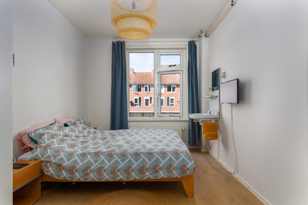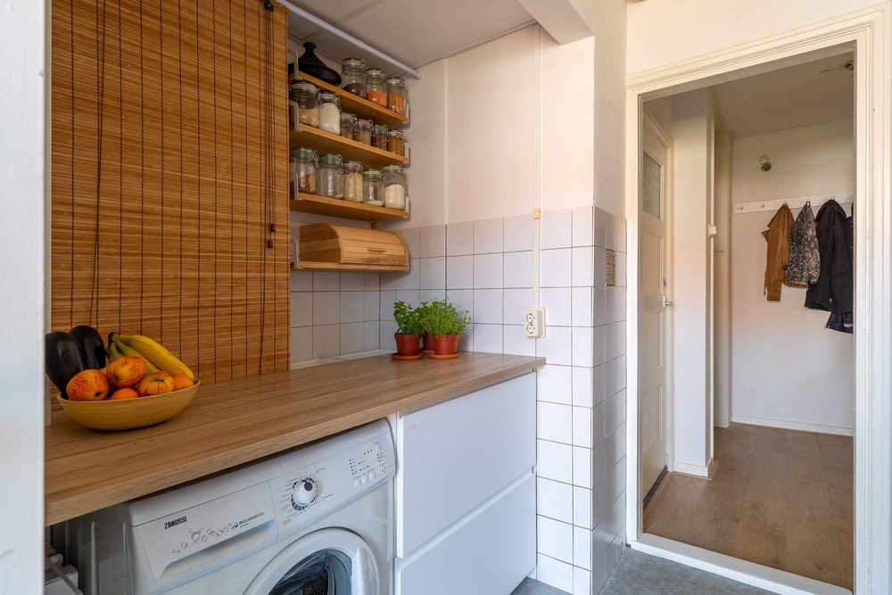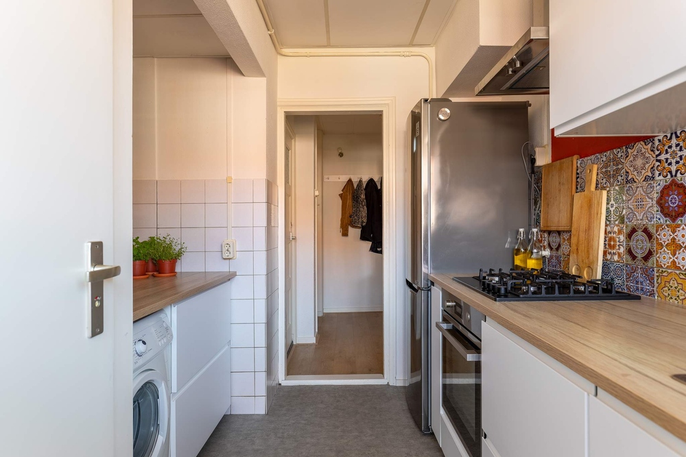 Tweede woonlaag: entree met toilet en meterkast. De doorzon-woonkamer is ca. 36 m² groot met aan de voorzijde zicht op water en groen. De woonkamer beschikt over een tweetal vaste kasten. De nette keuken uit 2018 is ca. 7 m² en voorzien van een 4-pitsgaskookplaat, afzuigkap, vaatwasser en spoelbak. Tevens is er een mooie ruimte ingedeeld waar de wasmachine kan staan. Vanuit de keuken is er toegang tot de badkamer. Deze is ca. 2 m² groot en beschikt over een douche en wastafel. Aan de andere zijde van de woning bevinden zich de twee slaapkamers. Deze twee kamers zijn gescheiden van elkaar via een kleine hal met een ruime vaste kast. De slaapkamers zijn respectievelijk 11 m² en 10 m² groot. Vanuit de laatstgenoemde kamer is er toegang tot een balkon van ca. 3 m² groot, gelegen op het noordoosten. Aan de achterzijde is ook een balkon aanwezig. Deze is bereikbaar vanuit de keuken en is ca. 5 m² groot. Dit balkon is gelegen op het zuidwesten. Hier kan je de hele middag en een groot deel van de avond genieten van de zon.