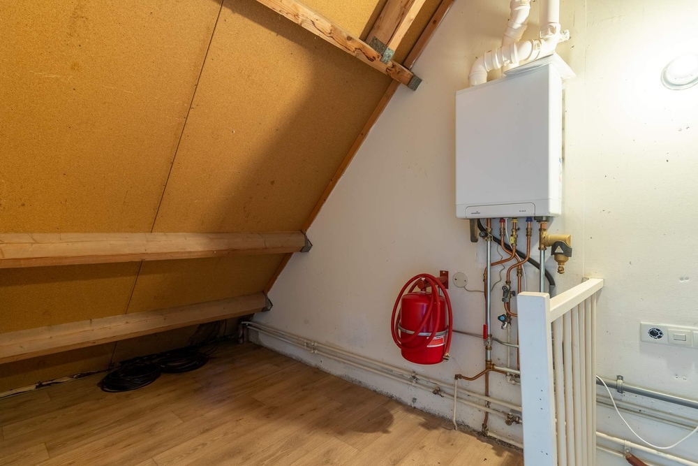Zolderverdieping: overloop met c.v. ketel (ca. 2017) en wasmachineaansluiting. De vierde slaapkamer is ca. 11 m² groot en voorzien van knieschotten.