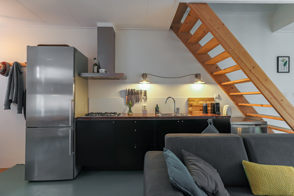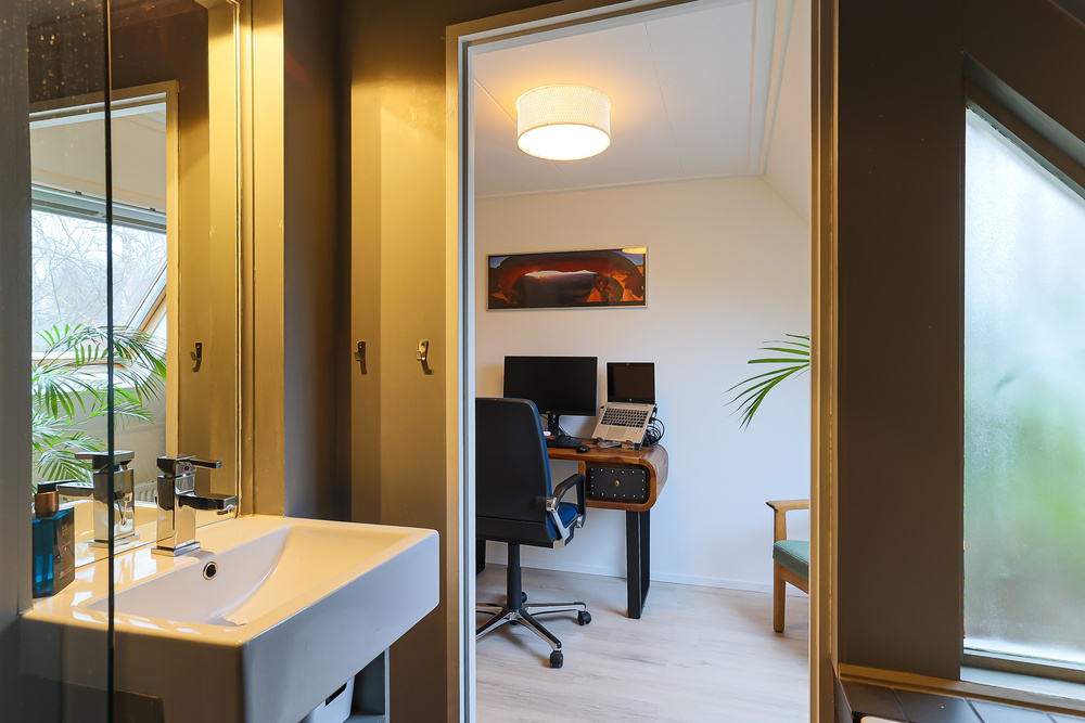 Eerste verdieping: een ruime slaapkamer van ca. 19 m² groot. Een deel van de slaapkamer wordt gebruikt voor een werkplek. Het slaapgedeelte en de werkplek zijn gescheiden van elkaar middels een kastenwand. De badkamer is ca. 3 m² groot en voorzien van een douche, een ligbad en een wastafel. Verder is er nog een afgesloten ruimte voor de wasmachine en de c.v. ketel.