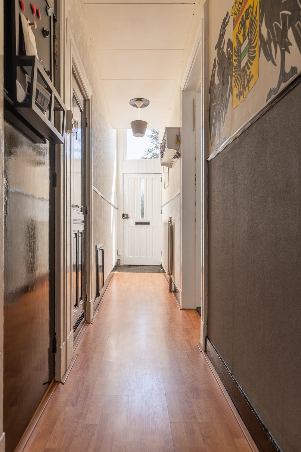 Entree/gang (ca. 1 bij 7 m.) met toilet/douchecombi en toegang tot alle vertrekken.Voorkamer (ca. 18 m2) met inloopkast (ca. 2,5 m2) voorzien van een vaste wastafel. Schouw, hoog plafond en kunststof kozijnen.Achterkamer (ca. 18 m2) met vaste kasten en zicht op de tuin.Eenvoudige keuken (ca. 6 m2) met vaste kast (opstelplaats wasmachine), keldertje, CV ketel (2009 HR combi eigendom) en deur naar de tuin.Ruime tuin (ca. 6,6 m. bij 9,8 m.) met gazon, bordes en achterom. S zomers hele dag zon, tot en met avond.
