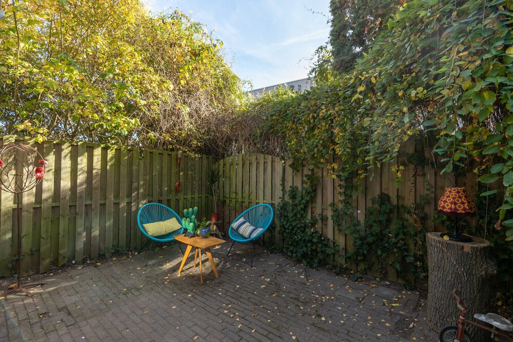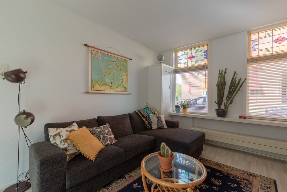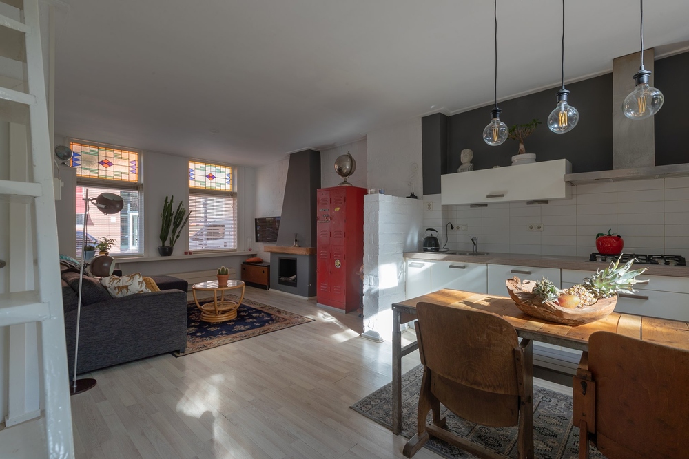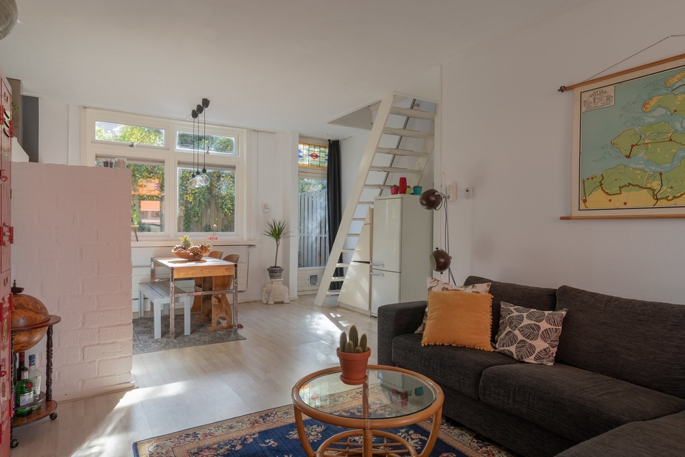Hal/entree.Doorzonwoonkamer met fraaie glas-in-lood-ramen en schouw v.v. haard. Open keuken (totaal met woonkamer ca. 30 m2). Nette keukeninrichting met vaatwasser en gaskookplaat. Rechte steektrap naar de verdieping en loopdeur naar de tuin.Verdieping: overloop met CV ketel (leaseketel 2015) en opstelplaats van de wasmachine en wasdroger. Deur badkamer en deur slaapkamer.Ruime slaapkamer aan de voorzijde (ca. 15 m2) met kunststof kozijnen, eventueel op te delen in twee kleine kamers.Eenvoudige doch nette badkamer (ca. 5 m2) met douche, toilet en ligbad. Geheel in lichte kleurstelling.Besloten stadstuin aan de achterzijde op zuid.