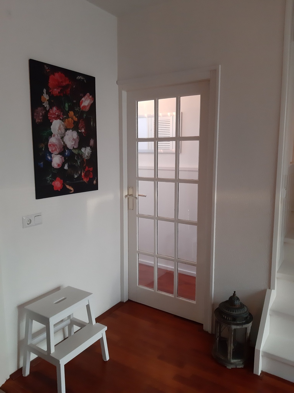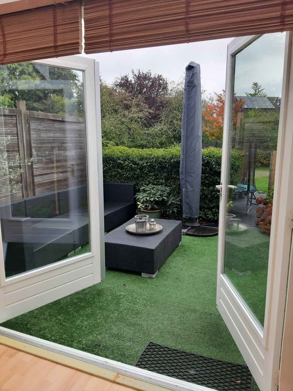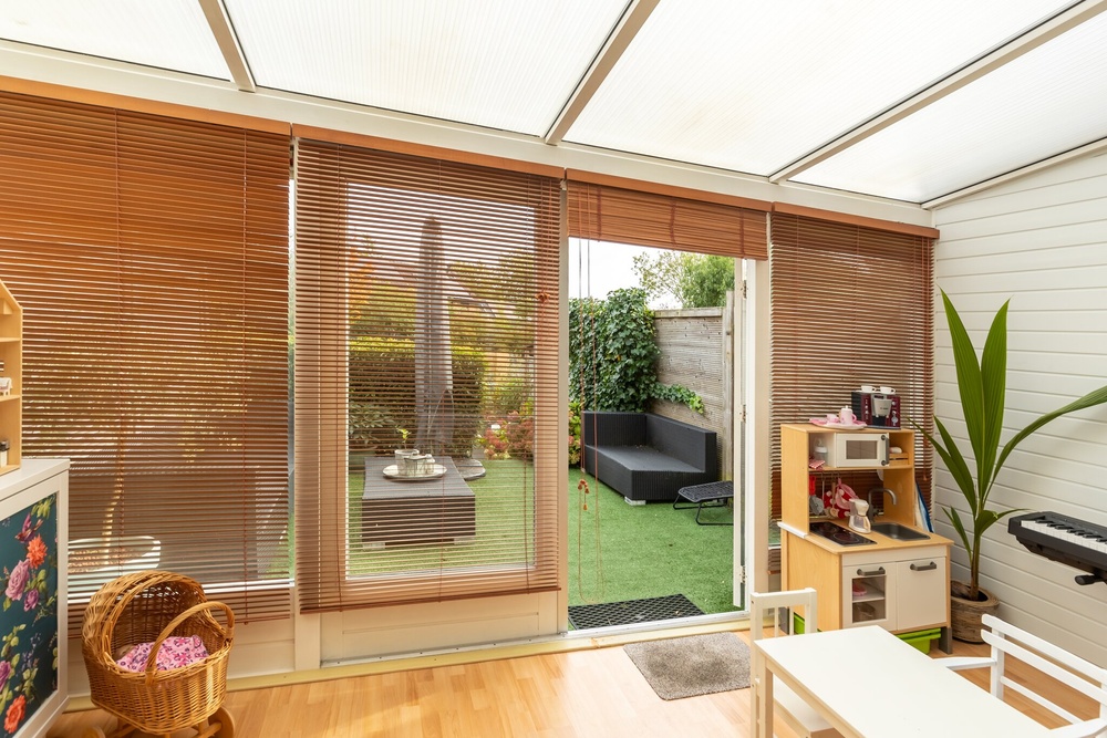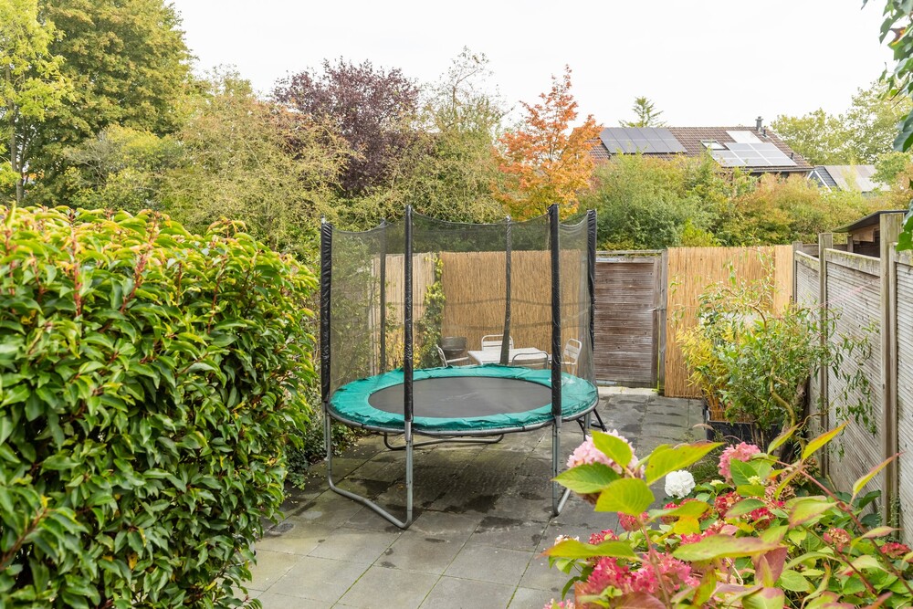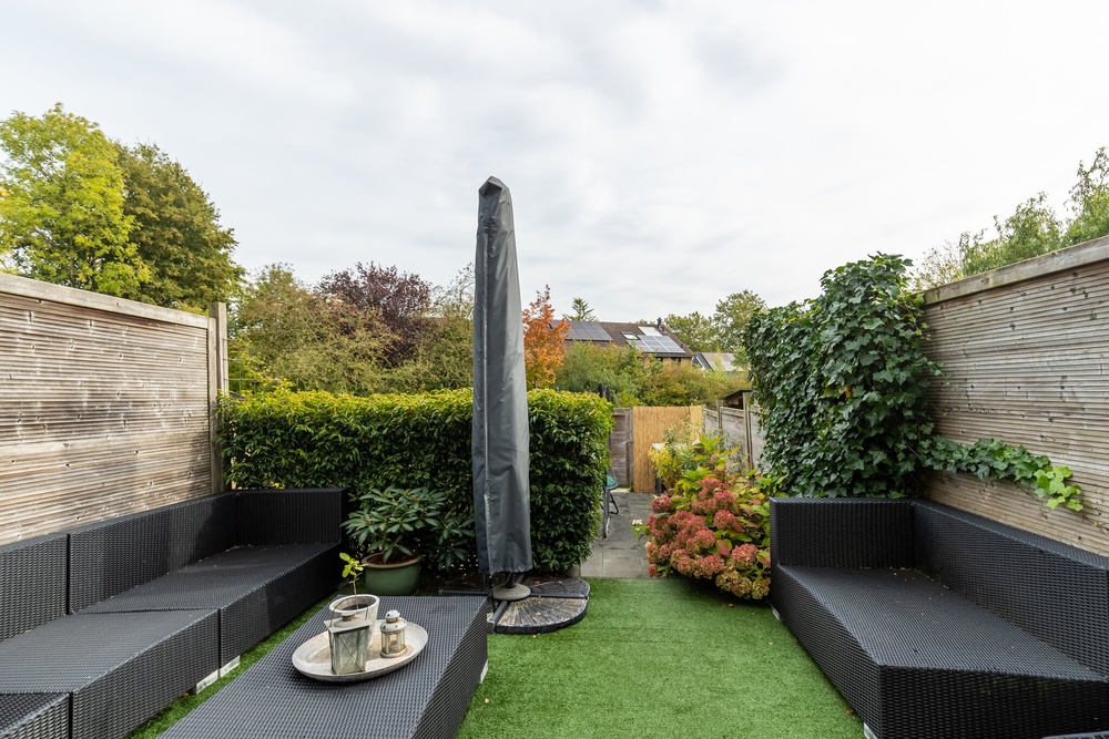 De tuin heeft een gezellig terras (ca. 20 m2) direct aan de achtergevel en een afstap naar de zonnige tuin (ca. 9 meter diep bij 5 meter breed). De tuin ligt direct aan een speelplaats/grasveld en is achterom bereikbaar.