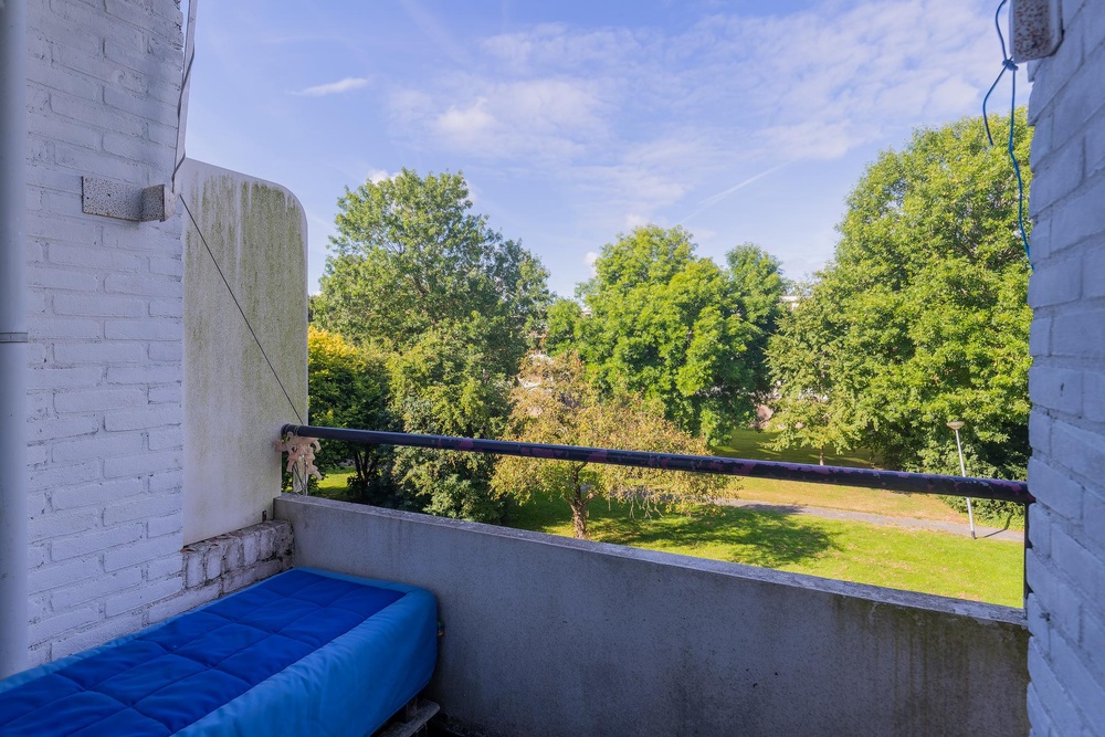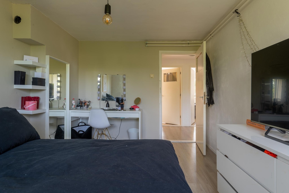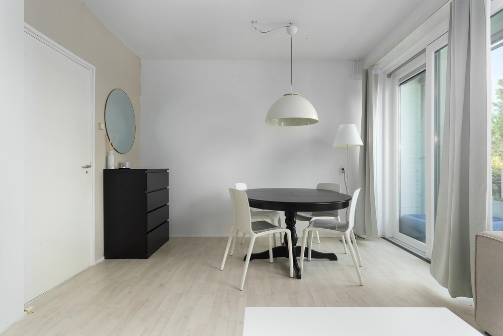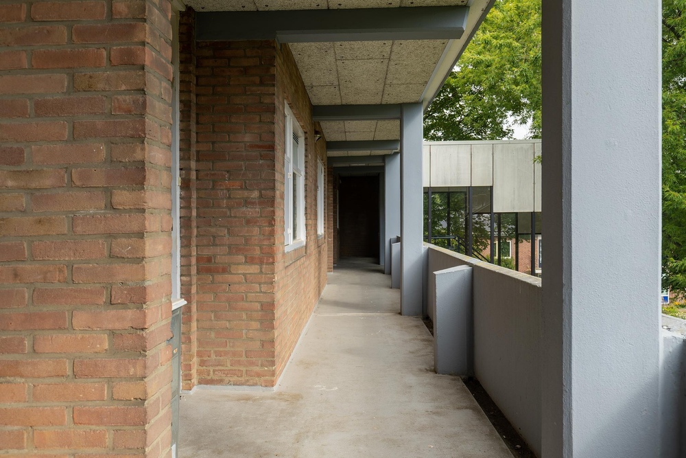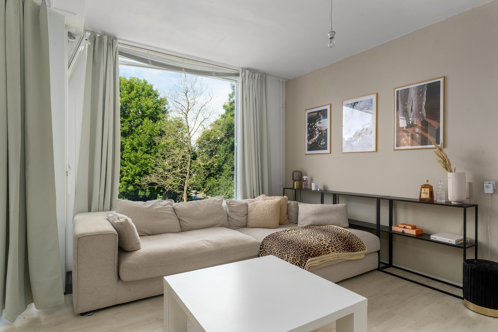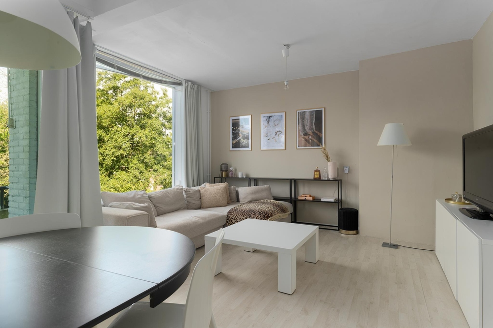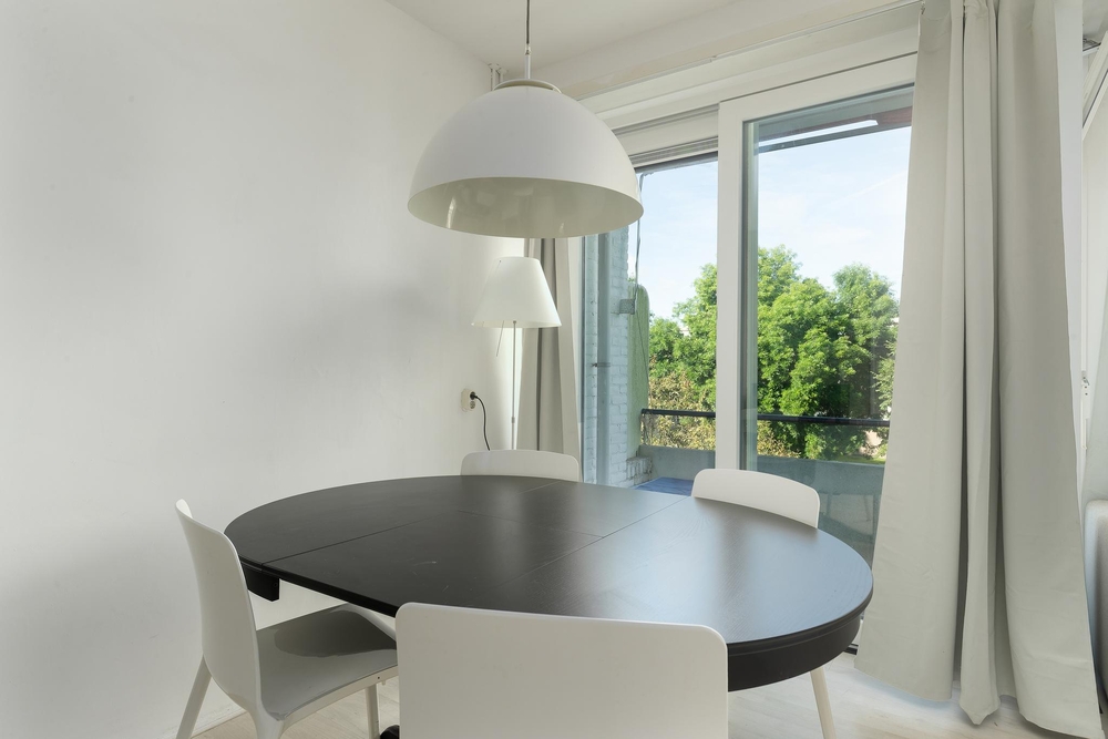 Entree, tochtportaal met toilet, doorloop naar open hal + keuken. Gezellige en heerlijk lichte woonkamer (ca. 21m2) met zicht op groen en een balkon op zuidwest (ca. 3m2). Semi-open keuken (totaal ca. 13,5 m2) met eenvoudig aanrechtblok en een vaste kast (CV ketel 2017, eigendom).