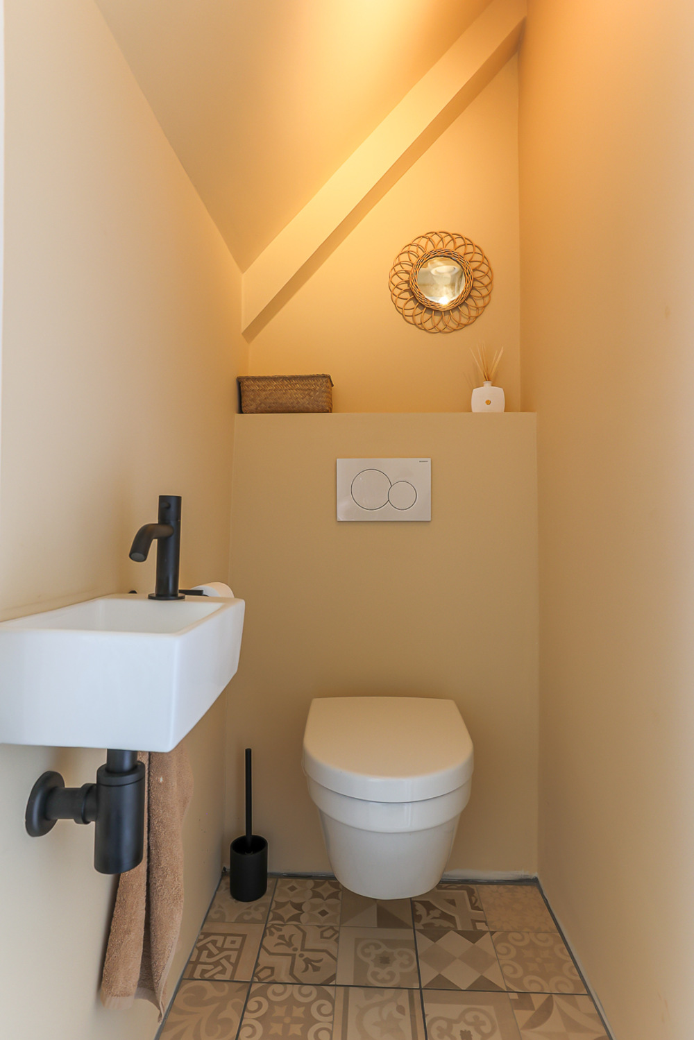 Begane grond: entree/tochtportaal met toegang tot de hal en het toilet. De lichte woonkamer is ca. 27 m² groot en is voorzien van een erker en een schuifpui naar de achtertuin. De dichte keuken van ca. 13 m² groot is voorzien van een 4-pits gaskookplaat, een afzuigkap, een koelkast met vriesvak en een aansluiting voor de vaatwasser en de wasmachine. Vanuit de keuken is er toegang tot de badkamer van ca. 2 m² groot. Hier is ruimte voor een douche en een wastafel.