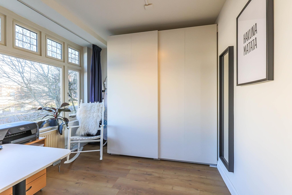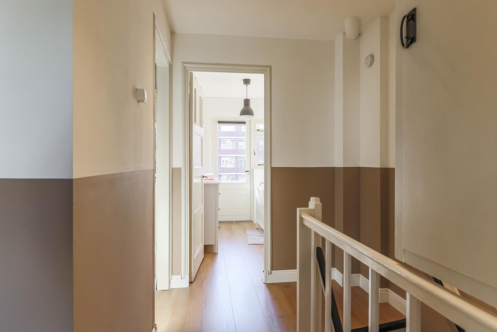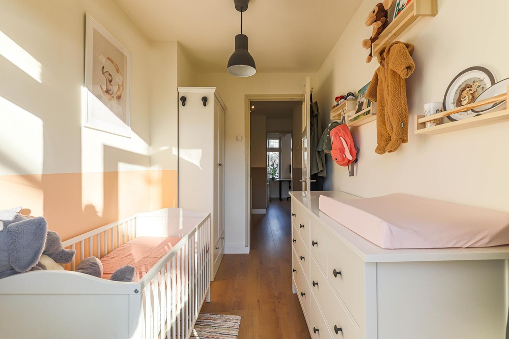 Overloop met vaste kast, drie slaapkamers van ca. 14, 11 en 5 m² waarvan de twee slaapkamers aan de achterzijde toegang hebben tot het balkon. In de masterbedroom een bergkast met de C.V. ketel (2022 eigendom).De badkamer (ca. 6 m2) is modern uitgevoerd met een inloopdouche, wastafelmeubel met dubbele spoelbak, designradiator en wasmachine aansluiting.