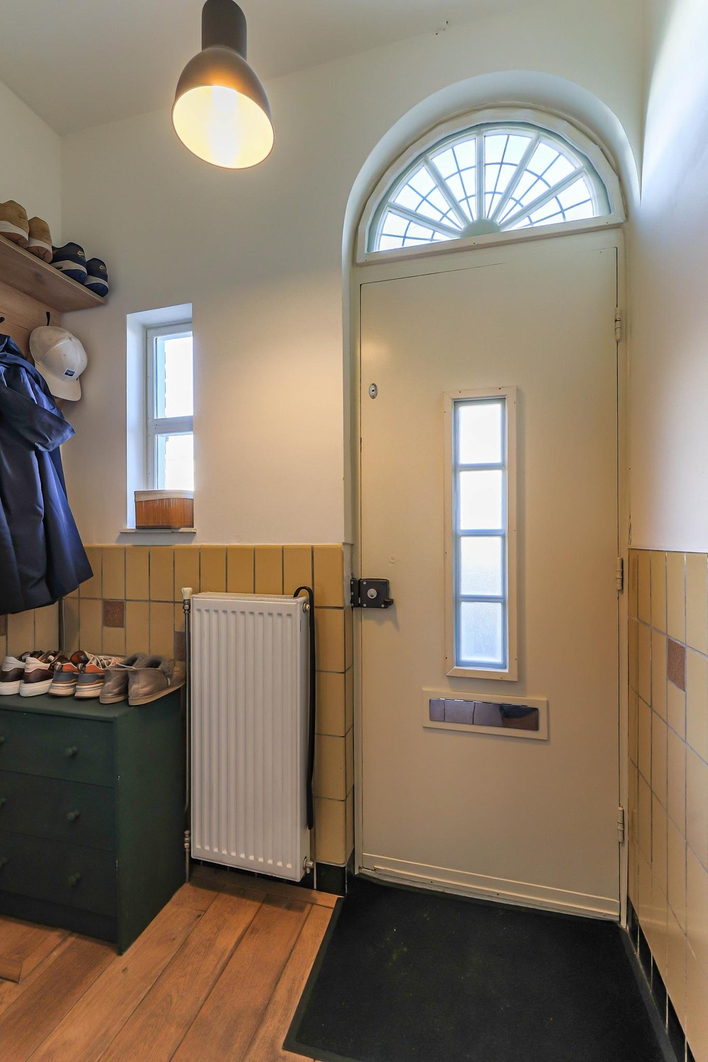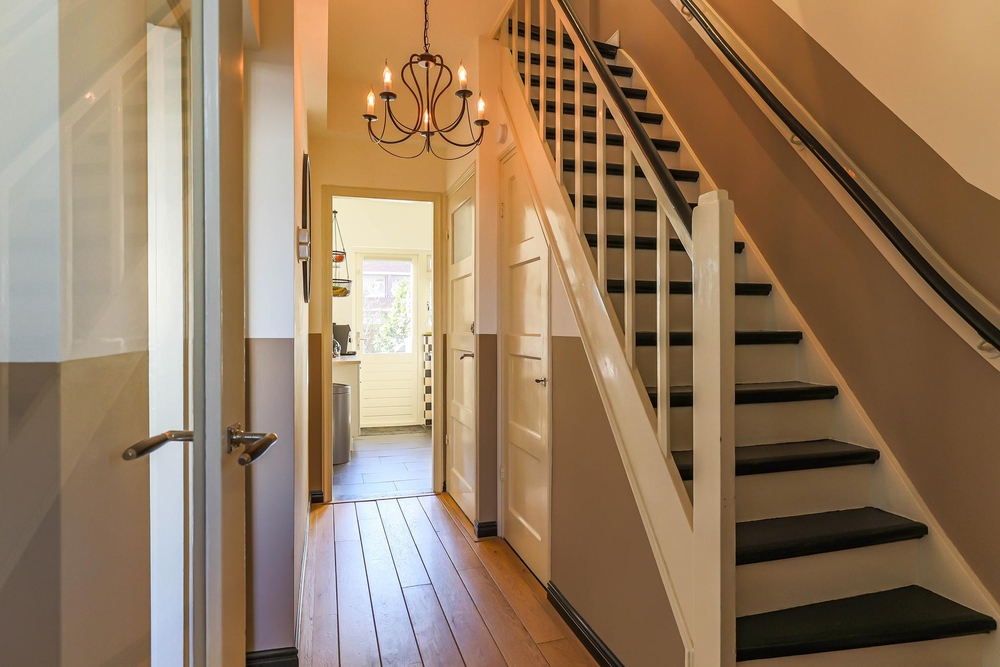 Prachtige entree in het tochtportaal. Sfeervolle hal met trap voorzien van trapkast met aardappelkeldertje, toilet en doorloop naar de keuken en woonkamer.Fraaie en sfeervolle woonkamer-en-suite van ca. 30 m² met houten vloerdelen, openslaande deuren naar de tuin en suitedeuren met glas-in-lood. Aan de voorzijde een mooie erker met glas-in-lood en uitzicht op de staat.Gesloten nette keuken (ca. 5m2) welke is voorzien van inbouwapparatuur met een 4-pits gaskookplaat, afzuigkap, koelkast, vriezer, nieuwe vaatwasser en combimagnetron. De keuken heeft eveneens toegang tot de achtertuin.