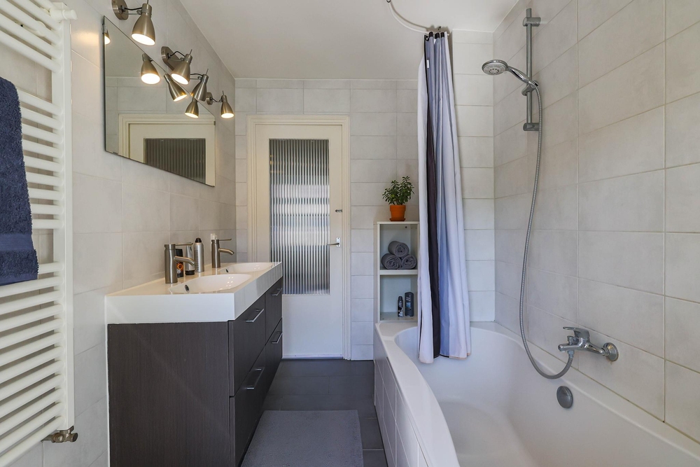 Begane grond: entree, tochtportaal (granieten vloer), hal, kelderkast, toilet, woonkamer (circa 30 m2) met houten vloer, leuke open haard en openslaande tuindeuren, dichte keuken (5 m2, inbouwapparatuur) met toegang tot de riante tuin.Eerste verdieping: overloop, bergruimte, 3 slaapkamers (resp. circa. 16, 11 en 5 m2) voorzien van vaste kasten. De grootste slaapkamer heeft openslaande balkondeuren. Nette betegelde badkamer (2015) met bad/douche combinatie, dubbel wastafelmeubel en via overdekt balkon de wasmachineaansluiting.