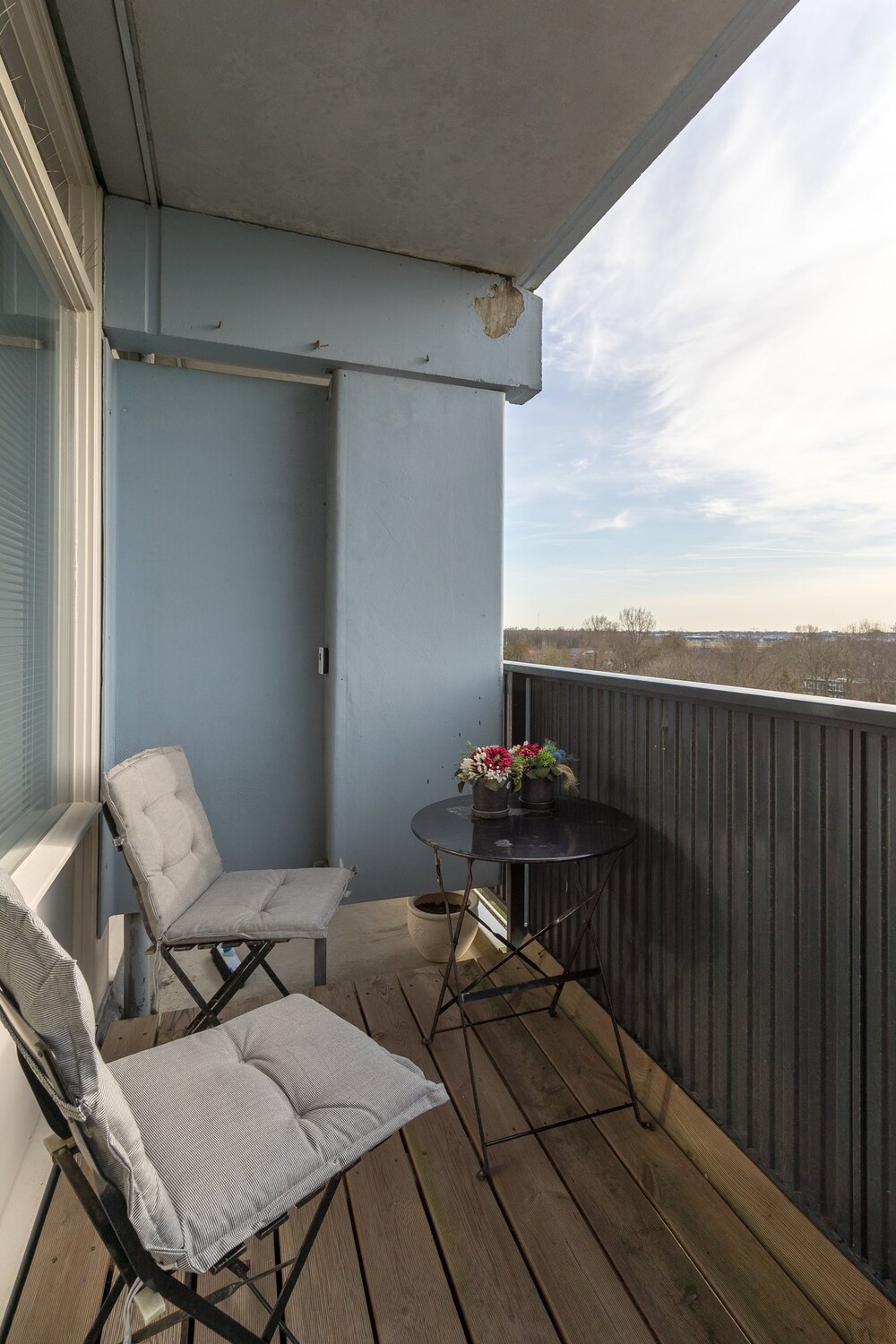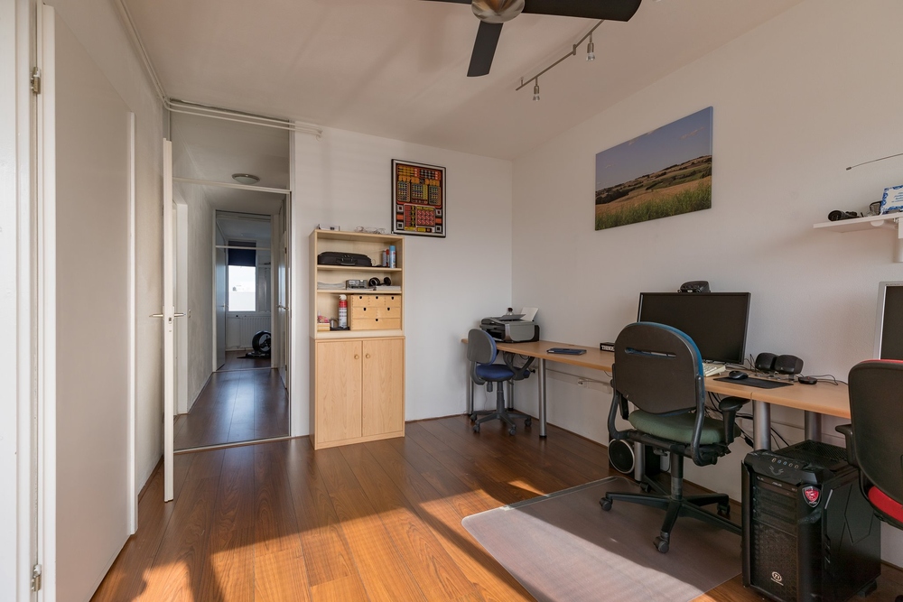 Indeling: Begane grond: centrale hal voorzien van intercom, brievenbussen, lift met toegang tot de bovengelegen verdiepingen, trappenhuis en bergingen. Grote gemeenschappelijke parkeerplaats.lift tot zesde verdieping met klein trapje naar de zevende verdieping tot bij de voordeur.Hal/entree met garderobe, groepenkast en toegang tot de woonkamer en eerste slaapkamer.Ruime L-vormige woonkamer (36 m2, voormalig twee kamers) welke is voorzien van een keurige laminaat vloer, open keuken en aparte eetruimte. Nette keuken (2007) voorzien van inbouwapparatuur: een vaatwasser, koelkast met vriesvak, gaskookplaat en afzuigkap. Het woonoppervlak van de woonkamer, keuken en de eetruimte bedraagt tezamen bijna 53 m²!Middels een tweede hal zijn is de tweede slaapkamer van 9 m², een kleine moderne badkamer met ruime douche en vaste wastafel, een apart modern toilet en de CV- (2011 eigendom)/wasruimte te bereiken. Het complex is gelegen aan de rand van Lewenborg en heeft zodoende een goede verbinding met de ringweg van Groningen. Daarnaast is het centrum van Groningen zeer goed bereikbaar met het openbaar vervoer. Het onlangs vernieuwde winkel- en gezondheidscentrum van de wijk en diverse scholen en kinderopvanggelegenheden liggen op loopafstand.Op de begane grond is de berging van de woning gelegen.