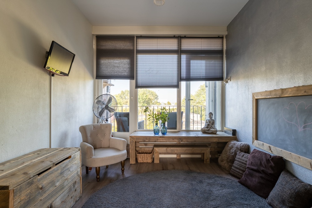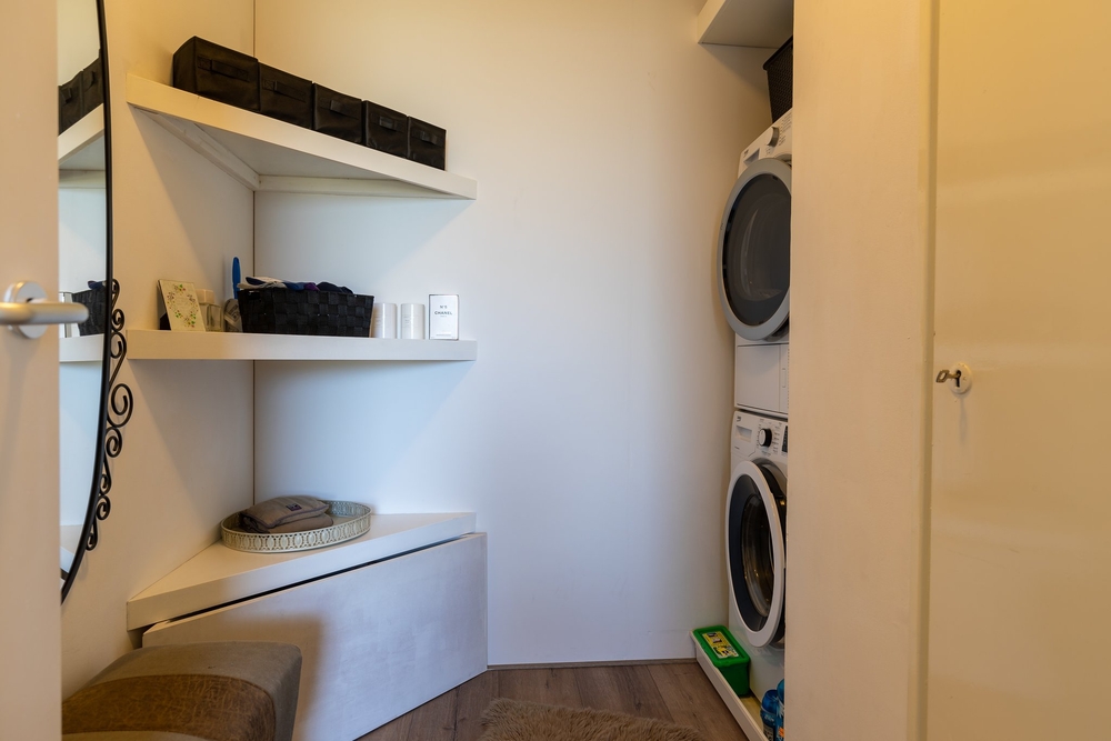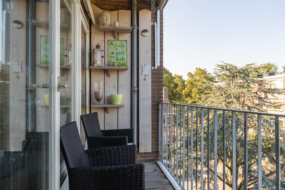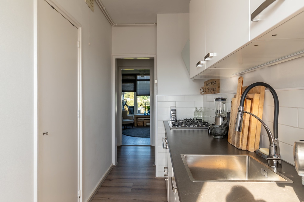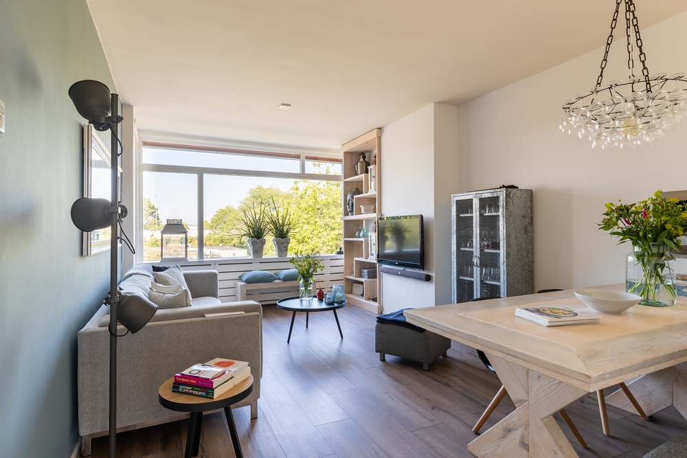 Afgesloten portiek met trappenhuis.Entree/hal: meterkast, intercom, keurig toilet en toegang tot alle vertrekken.Gezellige woonkamer van ca. 22 m2 met mooie vloer, brede vensterbanken (ombouw), elektrische zonwering en deur naar voorgelegen balkon.Balkon ca. 4 m2 eveneens v.v. elektrische zonwering.Slaapkamer 1: achterzijde (ca. 11 m2) met deur balkon op oost.Slaapkamer 2: voorzijde (ca. 10 m2) met deur naar voorgelegen balkon.Moderne keuken voorzien van inbouwapparatuur: ovenmagnetroncombi, koelkast, gaskookplaat en design filterkap. Fraai composiet aanrechtblad. Deur naar balkon en toegang tot de prachtig verbouwde badkamer: douchenis, ligbad, wastafelmeubel met kommen en een vaste kast met de CV ketel (HR combi, 2017, eigendom).Vanuit de hal is een luxe walk-in-clouset bereikbaar van ca. 5 m2, eveneens opstelplaats voor wasmachine en droger.In de kelder bevindt zich de inpandige fietsenberging. Bijzonderheden: VVE bijdrage € 100,- per maand inclusief opstalverzekering, buitenonderhoud, schilderwerk muv inpandige kozijnen, beheer, schoonmaak portieken, glazenwasser en tuinonderhoud), dus onderhoudsarm wonen. Gratis parkeren voor de deur. Volledig dubbel glas.