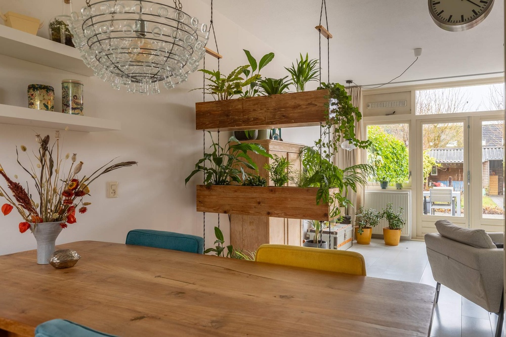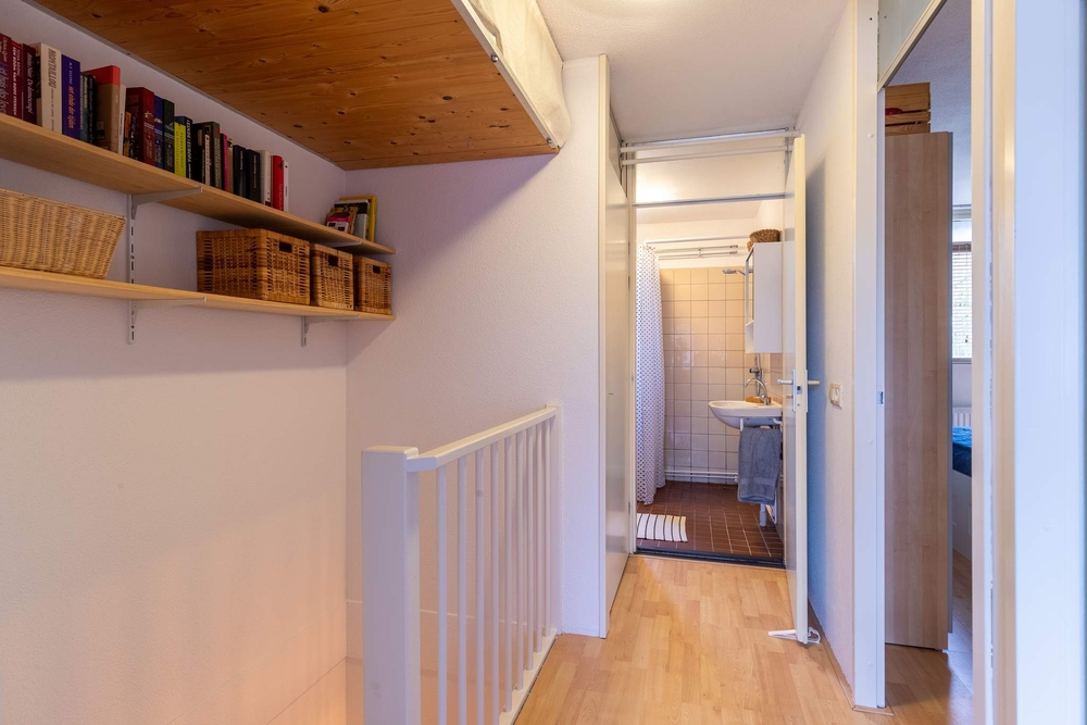 Begane grond: entree, hal met trapopgang, garderobe, toilet en meterkast, tuingerichte woonkamer (ca. 34 m2) met openslaande tuindeuren en open keuken met keukenblok (v.v. inbouwapparatuur) in L-opstelling. Vanuit de woonkamer is een kantoortje van ca. 8 m2 aanwezig.Eerste verdieping: overloop met wasruimte en 3 slaapkamers: ca 12, 12 en 7 m2. De kleine slaapkamer heeft een leuke extra slaapverdieping! Verder een basis badkamer met douche, wastafel, tweede toilet en wasmachineaansluiting.