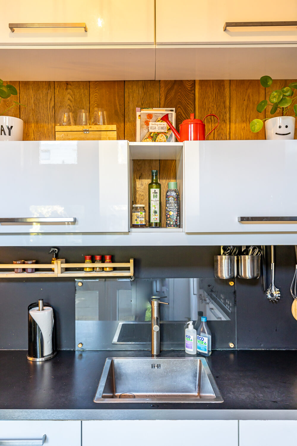 Sfeervolle, royale (80 m2) en gemoderniseerde schipperswoning met o.a. een prachtige woonkamer v.v. hoge plafonds, drie slaapkamers en een heerlijk zonnige tuin op het zuidwesten. Goed geïsoleerd (C-label) en met vloerverwarming op de begane grond.