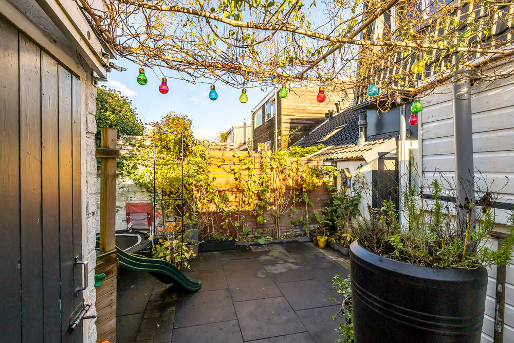 Royale en zonovergoten stadstuin op zuidwest (ca. 30 m2) met een vrijstaande stenen berging. Hier is het heerlijk toeven!