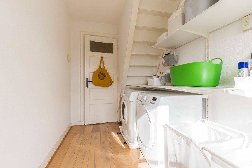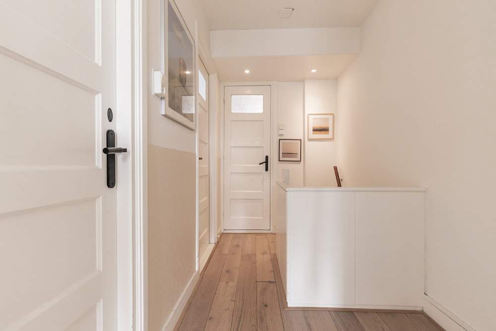 Entree/hal, toilet met fonteintje, trapopgang een doorloop naar de woonkamer.Sfeervolle woonkamer met prachtige open woonkeuken (totaal ca. 36 m²) die uitkijkt op het ruime achter gebied en een gezellige dakterras (ca. 16 m2 op de avondzon). Een fraaie houten vloer (Jatoba), de erker en een schouw geven het meer sfeer.De open keuken is modern (2015) en heeft een hoekopstelling met bar en een separaat wandmeubel, geheel in lichte kleurstelling en voorzien van alle gemakken: vaatwasser, grote oven, koelkast, vriezer, gaskookplaat en rvs afzuigkap.