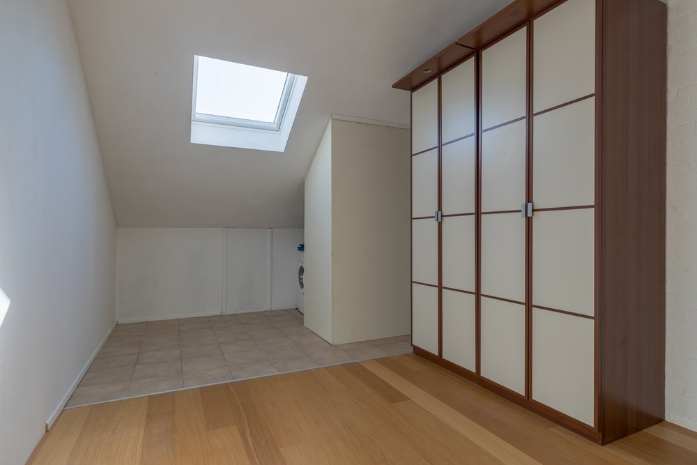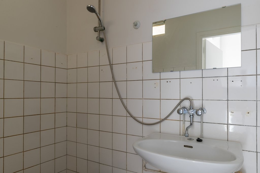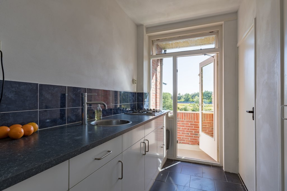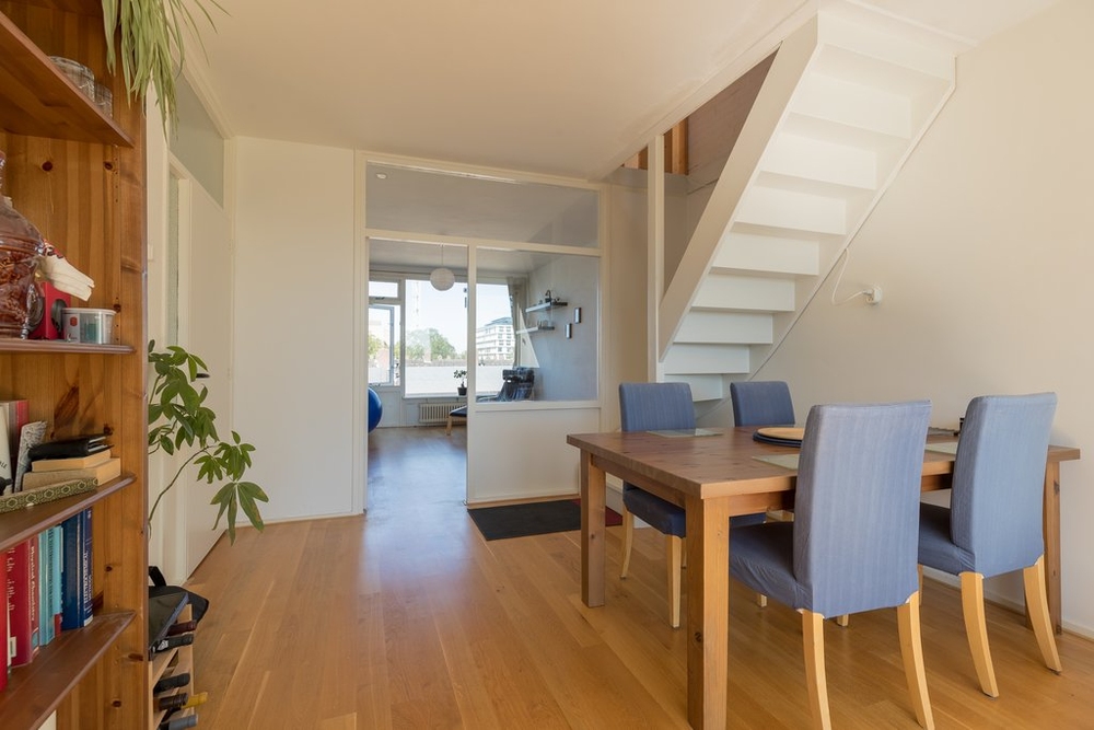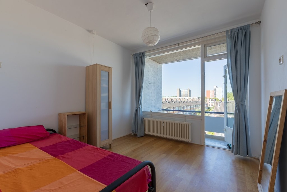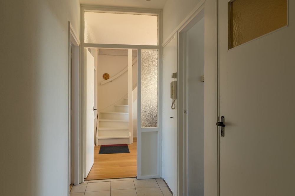 Centrale portiek. Trappenhuis.Entree met hal v.v. een eenvoudig toilet, meterkast en toegang tot de woonkamer, keuken en slaapkamers.Ruime doorzonwoonkamer (ca. 36 m2, Engelse suite) met voor- en achterkamer, voorzien van een open trap naar de zolderverdieping.Eenvoudige keuken (ca. 5,5 m2) met deur naar achtergelegen kleine balkon, vaste kast en toegang tot de badkamer. Eenvoudige badkamer (ca. 3 m2 met douche en vaste wastafel).Slaapkamer (ca. 10 m2) aan de voorzijde. Deur naar voorgelegen balkon. Balkon op west (ca. 4 m2 middag- en avondzon).Zolderverdieping met berg-/slaapkamer (ca. 20 m2) en een tweede kamer (ca. 17 m2) met wasmachineaansluiting. Beide kamers voorzien van een dakraam.De kap is geïsoleerd.