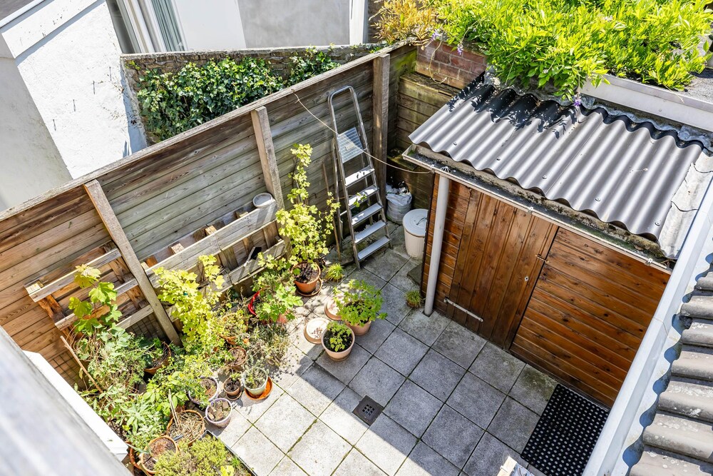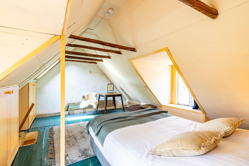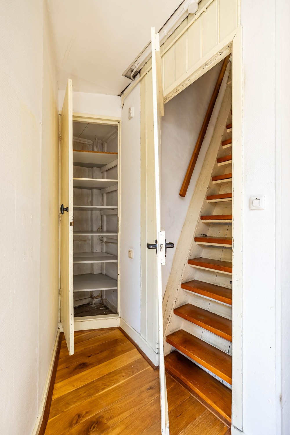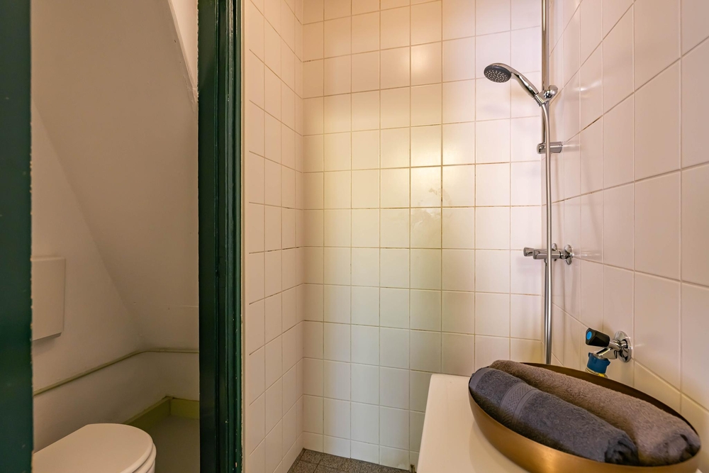 Begane grond: entree/hal, woonkamer (ca. 28 m2) met hoog en authentiek plafond, half open eenvoudige keuken. Vanuit de keuken toegang tot de leuke gedeelde tuin. Vanuit de hal is ook de badkamer en het toilet te bereiken.Verdieping: sfeervolle slaapzolder (18 m2) met bergruimte en cv-opstelling. Deur naar het zonnige (op het zuiden georiënteerde) dakterras van 9 m2!