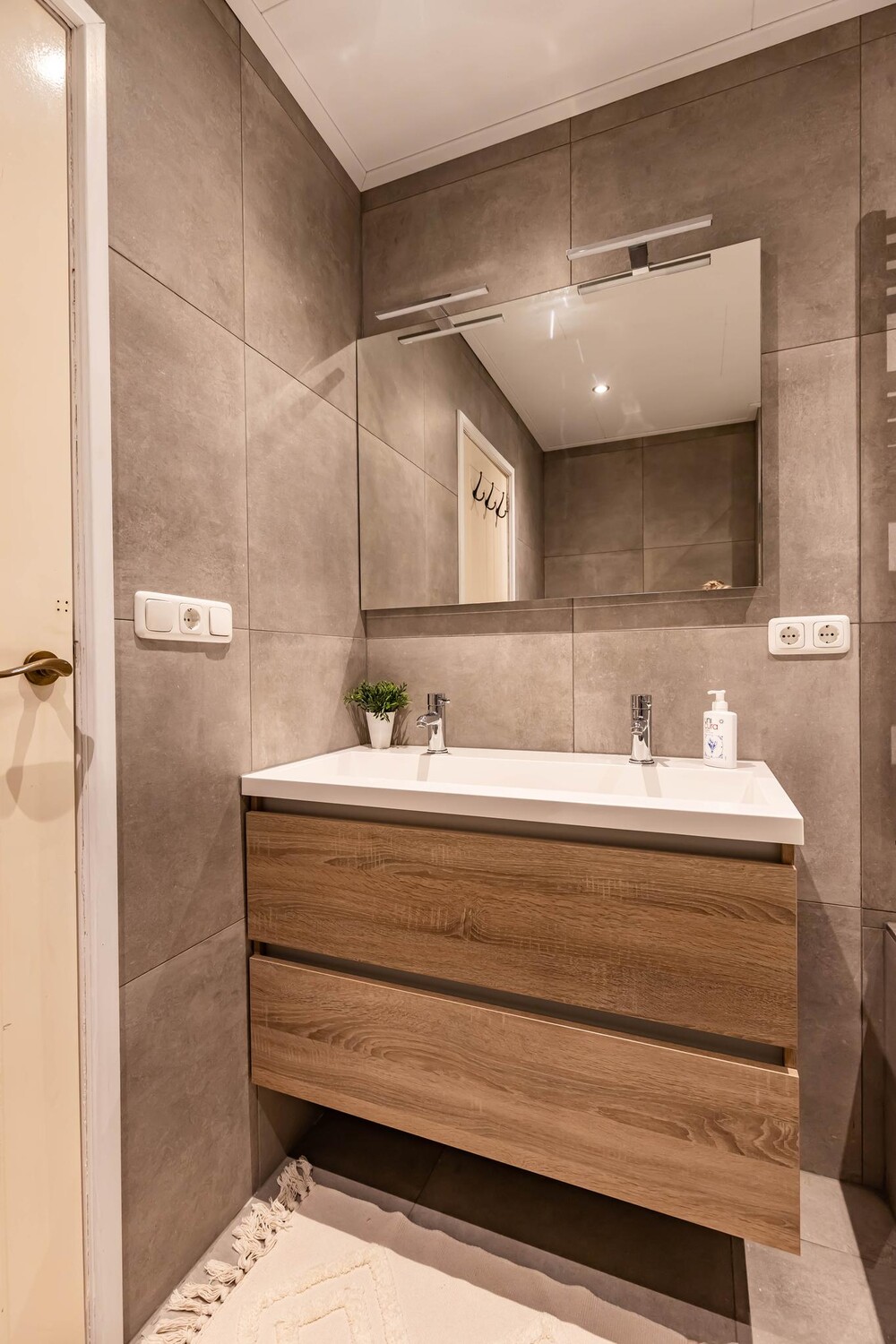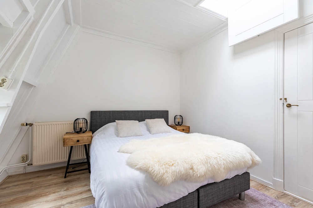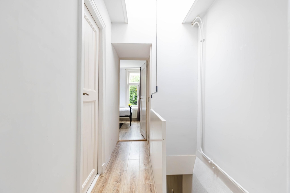 Mooie open trap in de woonkamer die uitkomt op een lichte overloop. De dakkoepel geeft veel lichtinval en daarnaast voorzien van een vaste kast met aansluiting voor de wasmachine en wasdroger.Sfeervolle slaapkamer voorzijde (ca. 12m2) met kleine dakkapel en dakkoepel. Slaapkamer achterzijde (ca. 12 m2) met zicht op de tuin en de CV kast (Remeha HR combi 2021). Moderne badkamer (ca. 4m2, 2022) met een lig-/douchebad, 2e toilet en wastafelmeubel.