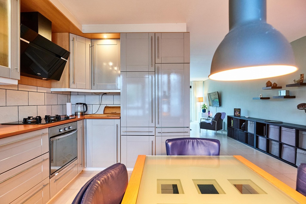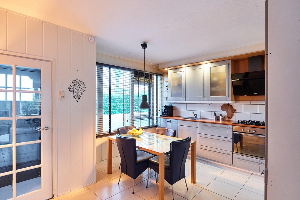 Entree/hal met meterkast, garderobe en doorloop naar de keuken en woonkamer.Entree in de ruime (ca. 19 m2) woonkeuken met plavuizenvloer en keukeninrichting in hoekopstelling, voorzien van inbouwapparatuur: koel-/vriescombi, vaatwasser, oven en gaskookplaat met design afzuigkap.L-vormige en tuingerichte woonkamer (ca. 24 m2) eveneens met plavuizenvloer, additionele zijgevelramen, vaste trapkast en loopdeur naar de tuin.Tussenhal met modern toilet en de trapopgang.
