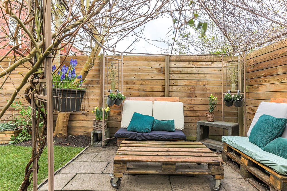 Een ruime en speelse achtertuin van bijna 60 m2! De zonnige tuin is verzorgd en heeft een houten schuur (9m2). De tuin biedt genoeg privacy en is achterom met de fiets(en) bereikbaar. Leuk detail is dat door de hoekligging en dubbele schuttingdeuren er genoeg ruimte is voor je motorstalling. Gelegen op het noordwesten.