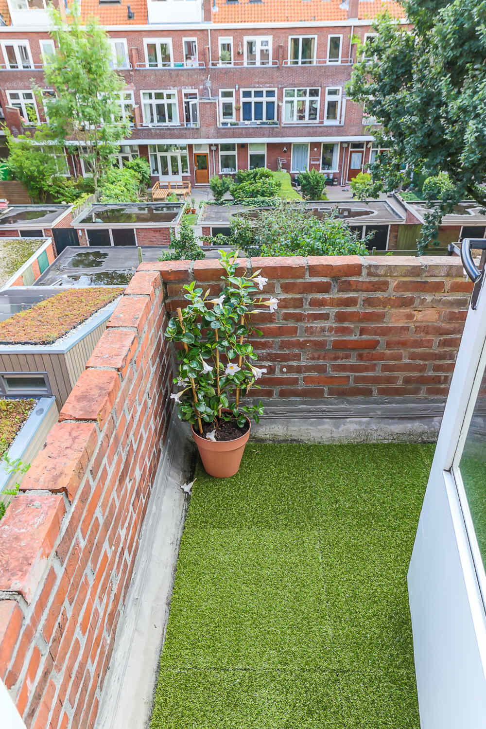 Begane grond: open portiek met trapopgang naar...Eerste verdieping: entree, hal, woonkamer en suite van ca. 31 m2 met originele suitedeuren en paneeldeuren en balkon aan voor- en achterzijdezijde. Sfeervolle woonkamer (16 m2) en aan de achterzijde een gezellige eetkamer (15 m2) met open keuken (2015) met inbouwapparatuur.Tweede verdieping: overloop, slaapkamer van ca. 14 m2 met vaste kast, slaapkamer van ca. 7 m2, nette badkamer uit 2019 (3 m2) met douche, wastafelmeubel en wasmachineaansluiting, separaat toilet (ook vernieuwd) en balkon (op zuid 3m2).Derde verdieping: toegankelijk middels vaste trap; ruime en lichte zolderkamer (ca. 14 m2) en een heerlijk riant en zonnig dakterras (15 m2!). Veel en lang zon; gewoon genieten.