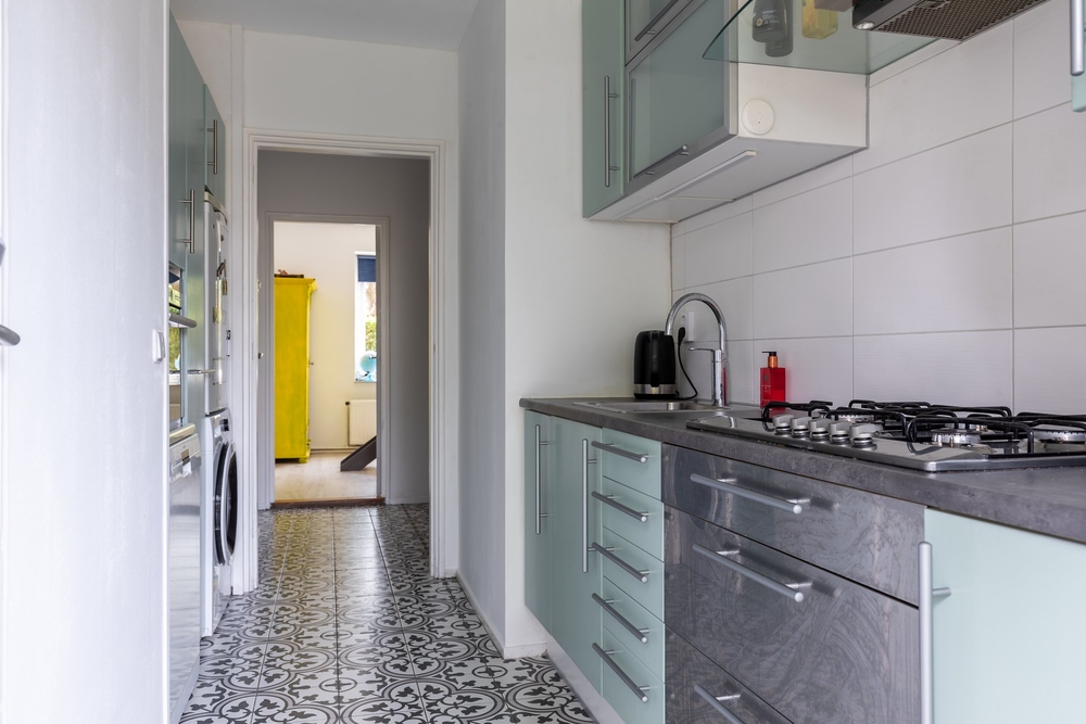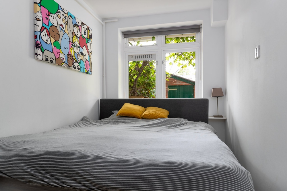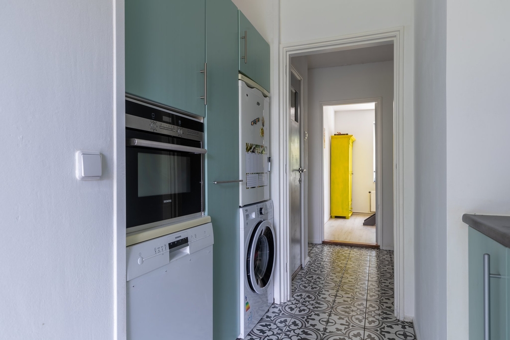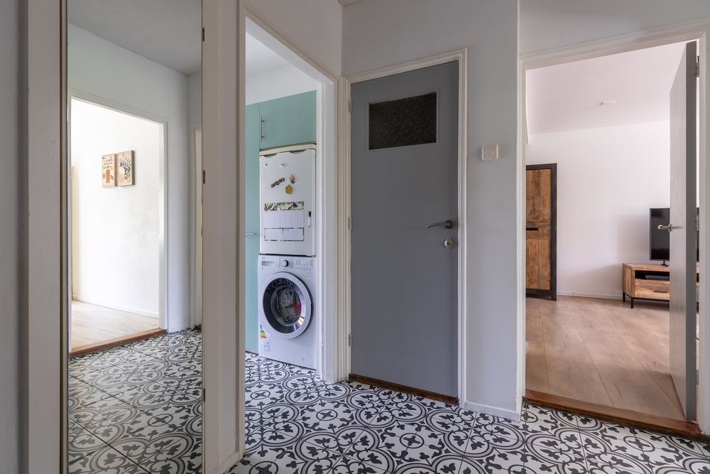 INDELING Begane grond: entree via open portiek. De ruime hal biedt praktisch gezien toegang tot alle vertrekken van de woning. De lichte woonkamer met vaste inbouwkast is ca. 31 m² groot en is strak en netjes afgewerkt. Vanuit de woonkamer is er zicht op een kleine, maar goed onderhouden voortuin met veel privacy. Aan de voorzijde van de woning bevindt zich de grootste slaapkamer van ca. 10 m² groot. De andere slaapkamer is ca. 8 m² groot en beschikt over een vaste inbouwkast. De half open keuken van ca. 7 m² beschikt over een 5 pits-gaskookplaat met afzuigkap en een koelkast. Aan de andere zijde bevindt zich een vaatwasser en oven. Vanuit de keuken heb je toegang tot de badkamer van ca. 2 m² groot met inloopdouche en wastafelmeubel. Verder is er nog een afzonderlijk toilet aanwezig en een ruime bergkast.