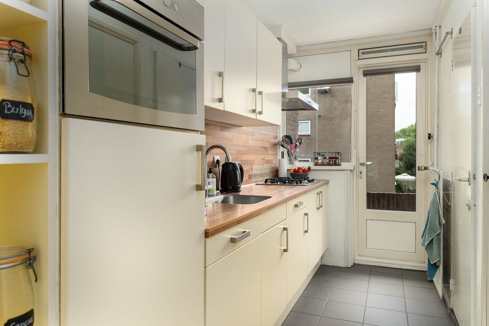 Begane grond: afgesloten centrale entree met intercom, trappenhuis naar de verdiepingen, en toegang tot de riante berging (gelegen in het souterrain).Eerste verdieping: entree, centrale hal, meterkast, hangend toilet (2016), ruime lichte woonkamer van ca. 34 m2 met een lekker balkon (4 m2) aan de voorzijde. Twee slaapkamers (10 en 8 m2). Gesloten keuken met keukenblok v.v. inbouwapparatuur en toegang tot het kleine balkon, de nette badkamer (2016, massagedouche en meubel) en een aparte wasruimte.