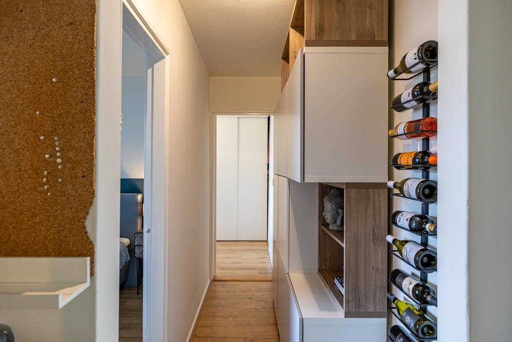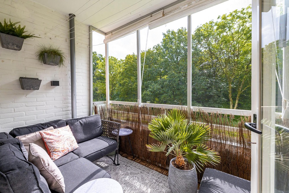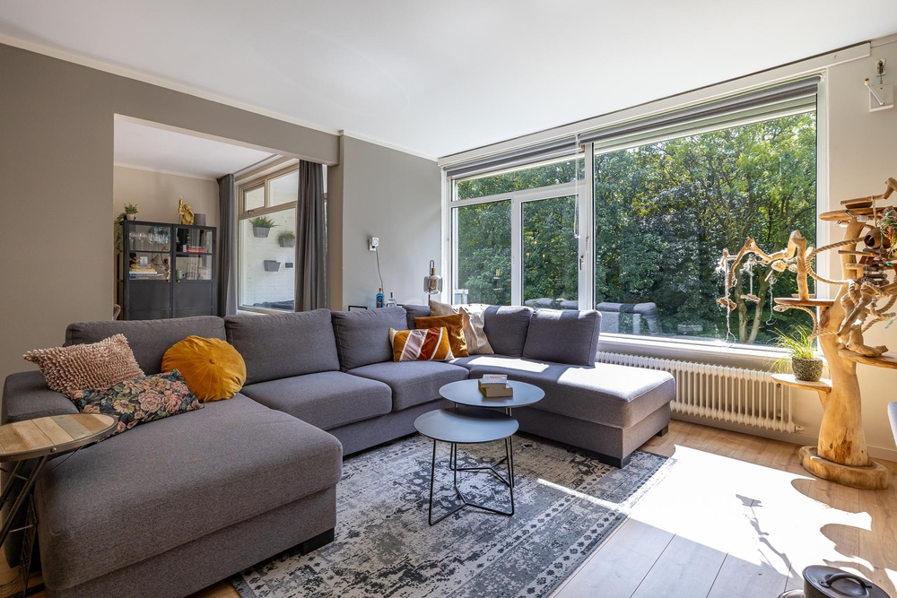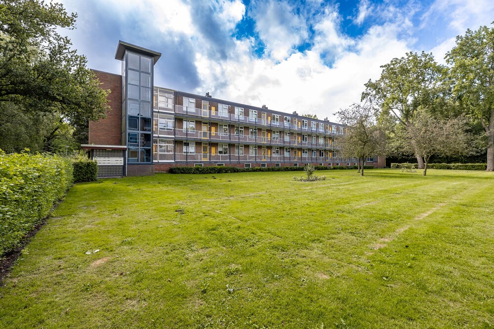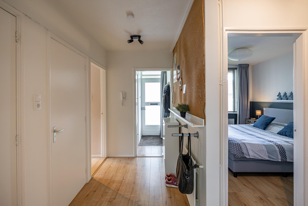 Afgesloten portiek, trappenhuis en lift. Bordes met twee opgangen waarvan een naast het appartement.Entree met tochtportaal en aansluitend een hal met toilet, vaste kast en toegang tot alle vertrekken.Fijne L-vormige woonkamer (zit- en eetkamer, tezamen ca. 34 m²) met aangelegen balkon (ca. 5 m2) op het zuiden. De woonkamer kijkt uit op een groenstrook en bebossing en geeft daardoor veel gevoel van privacy.Twee praktische slaapkamers (ca. 11 en 12m2) waarvan een met vaste kast.Moderne gesloten woonkeuken (ca. 9m²) met provisiekast en CV-kast. Hoekopstelling voor het zijgevelraam voorzien van alle gemakken: vaatwasser, ovencombi, koelkast, inductiekookplaat met afzuigscherm.Nette badkamer (ca. 2 m2) met douche en wastafelmeubel.In het Souterrain een ruime (14 m2) fietsenberging.