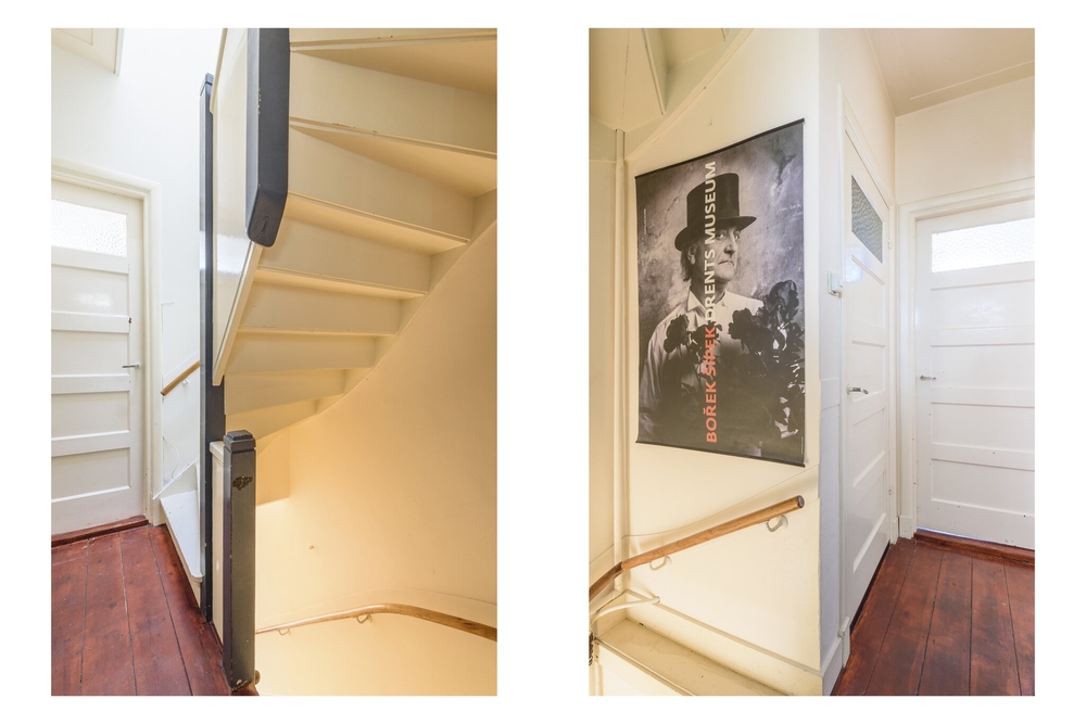 Entree/opgang. Overloop met modern toilet en toegang tot voor- en achterkamer en de keuken.Sfeervolle voorkamer (ca. 18 m2) met houten vloerdelen, vaste kasten, schouw, prachtige karakteristieke suite (glas-in-lood, vaste kasten).Achterkamer (ca. 13 m2) met schouw en openslaande deuren naar het achtergelegen balkon (ca. 4 m2).Eenvoudige gesloten keuken (optie: kan worden opengebroken naar de achterkamer voor een mooie open keuken) van ca. 5 m2. Wasmachine aansluiting, close-in boiler en deur naar balkon.