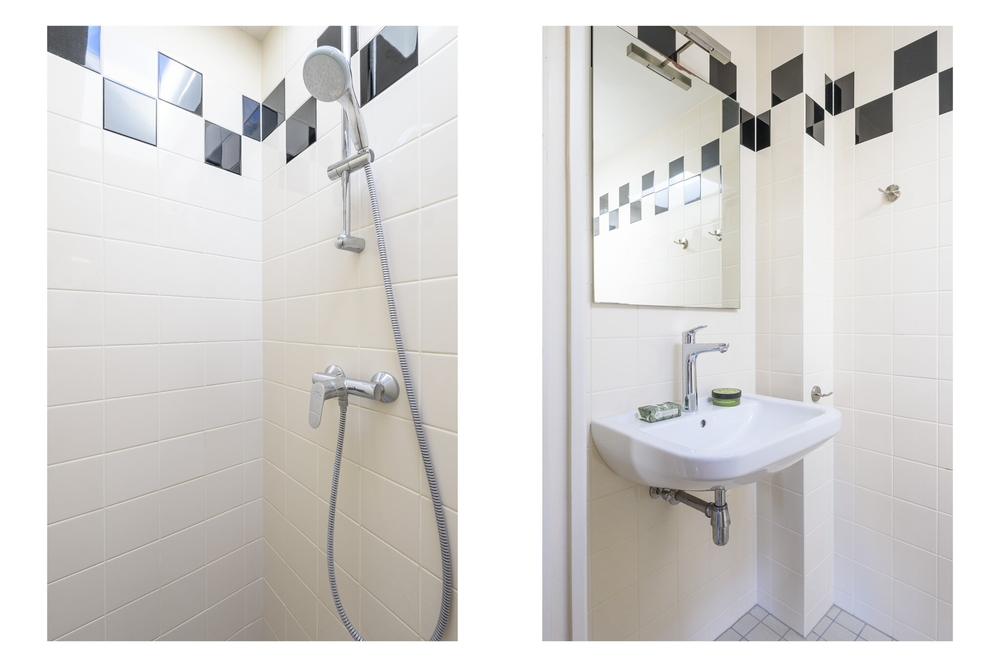 Verdieping: overloop.Drie slaapkamers van 18, 9 en 4 m2 ex kastenwand. De middelste slaapkamer heeft toegang tot de badkamer, dit is eenvoudig aan te passen naar twee slaapkamers. De kleine slaapkamer heeft een vaste kastenwand met CV ketel (2012, eigendom), optionele wasmachine aansluiting en deur naar klein balkon.