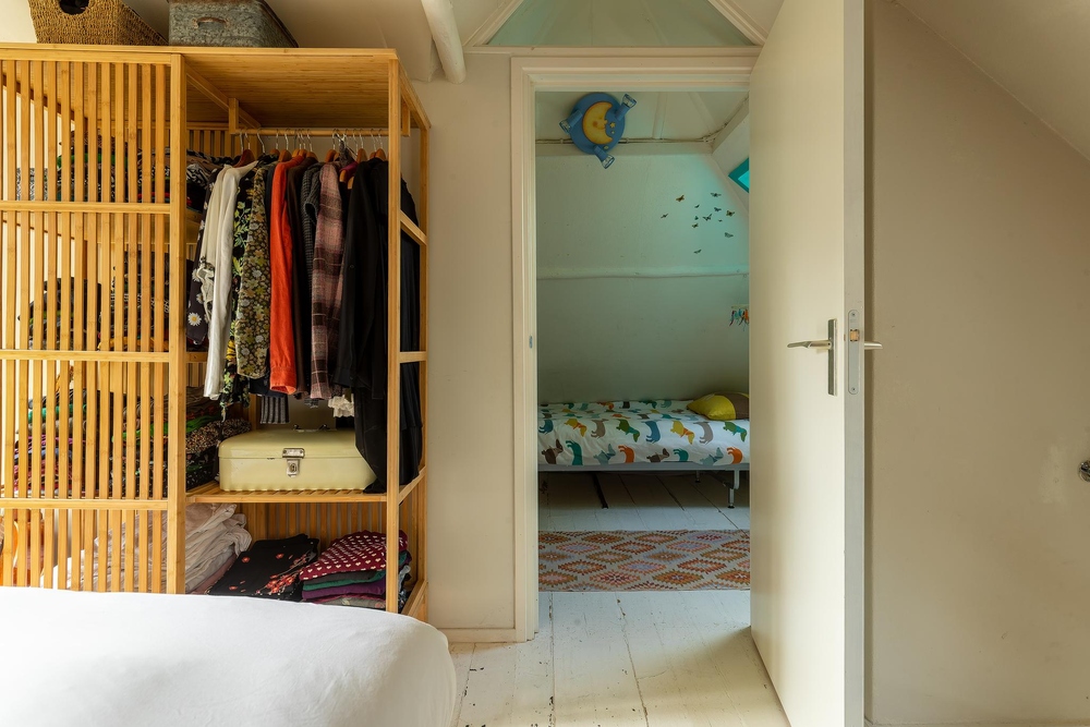 Open zolderkamer (ca. 10 m2) met dakkapel en doorloop naar een kleine slaapkamer (ca. 3 m2) met vaste wastafel en inbouwkasten. Zowel de zolderkamer als de slaapkamer zijn voorzien van een dakraam.Achtertuin: