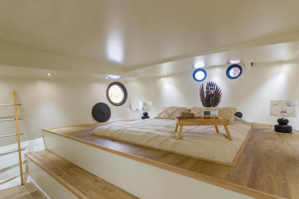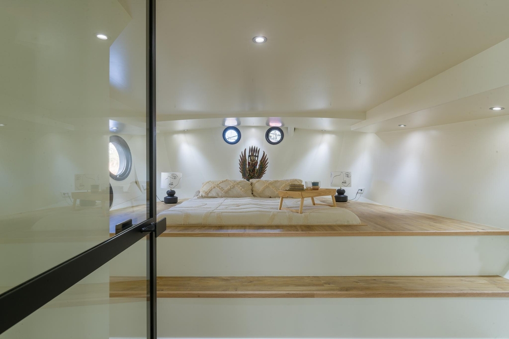 Er zijn twee unieke en ruime slaapkamers aanwezig.De eerste slaapkamer in het voorschip heeft een smaakvolle open badkamer met inloopdouche en een wastafelmeubel. Via prachtige stalen taatsdeuren kom je in de slaapkamer in het achterschip, onder de stuurhut. Hier vind je een prachtige houten bedombouw met opstap, een vaste linnenkast en een wastafelmeubel.