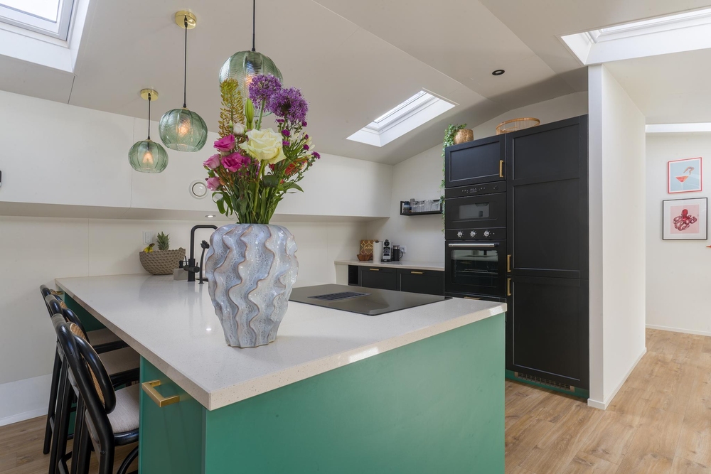 De woonkamer met open keuken van maar liefst 60 m2 is ruim en smaakvol ingericht, met fraaie houten vloerdelen, patrijspoorten en daklichten. De keuken is voorzien van een kook-/spoeleiland met inductiekookplaat en geïntegreerd afzuigsysteem, een vaatwasser en een wandmeubel met oven, separate combi magnetron en een koel-vriescombi.