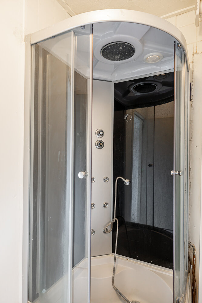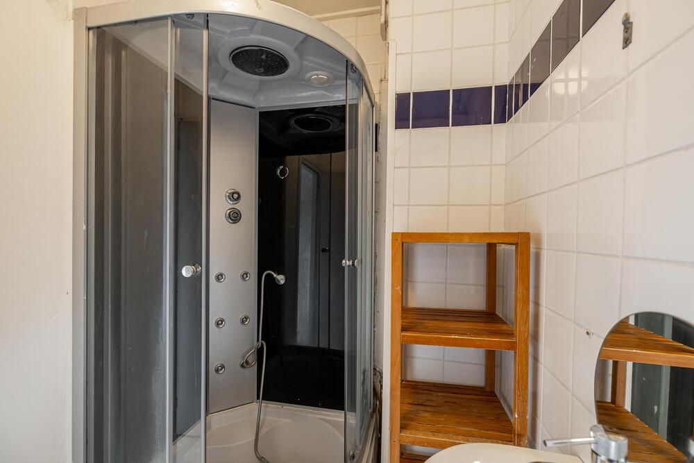 Eenvoudige badkamer (ca. 3 m2) met vlizoluik en doorloop naar kleine extra kamer (ca. 5 m2).