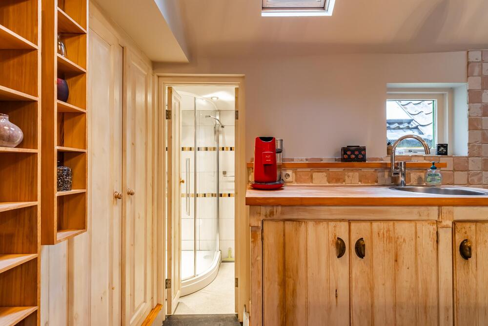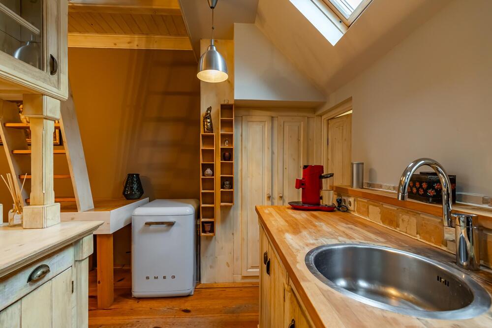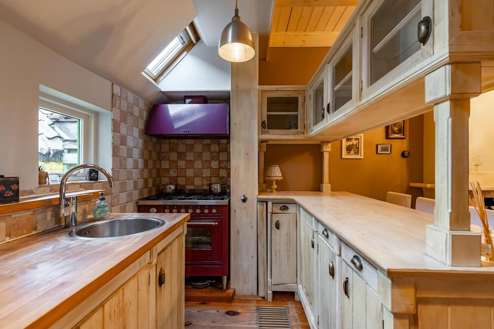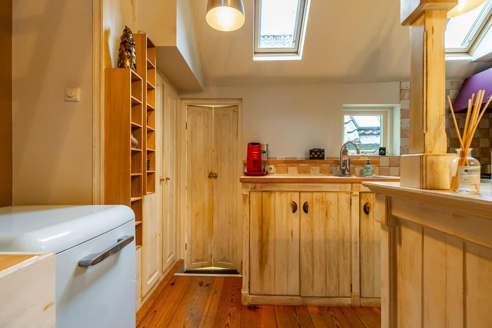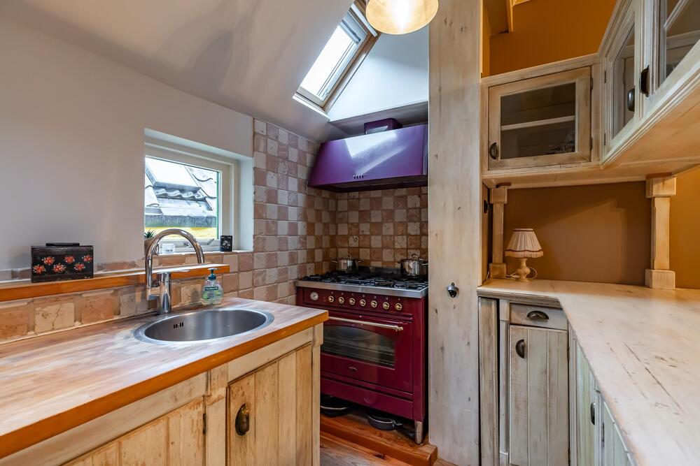 Leuke semi-open keuken voorzien van een gezellige bar met bovenkasten en een keurig keukenblokje met vrijstaand combigasfornuis en veel bergruimte in boven en onderkasten. Een gevelraam en twee dakramen geven extra lichtinval.