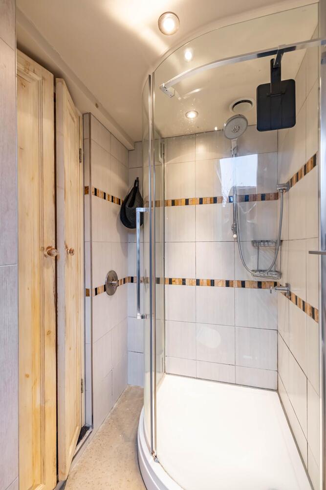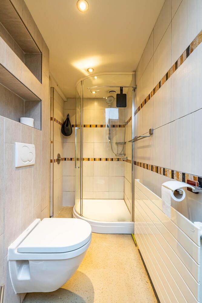 Toilet/douchecombinatie (ca. 3 m2) met toilet, douche, wastafel en aansluiting wasmachine. Deur naar de plaats.