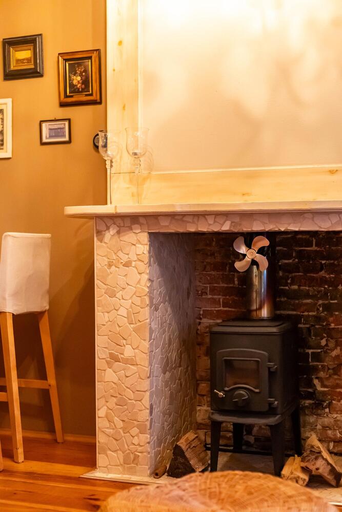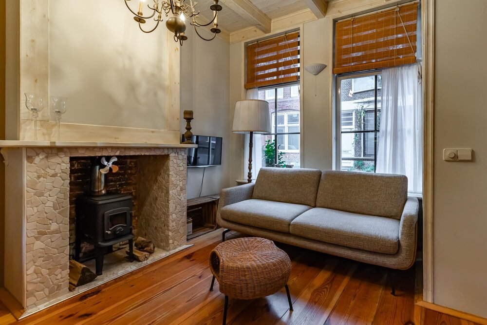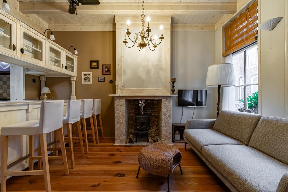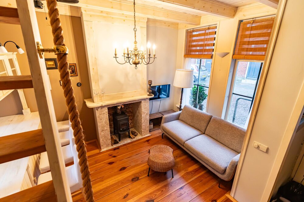 Sfeervolle woonkamer (ca. 21 m² met open keuken) met hoog plafond, een schouw, houten vloerdelen, doorloop naar de achtergelegen badkamer en een open bordestrap naar de verdieping.