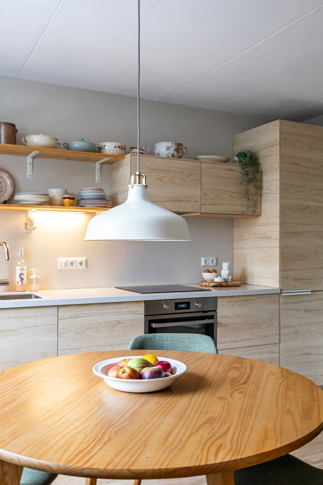 De keuken is modern (2022) en uitgerust met inbouwapparatuur: een vaatwasser, koelvries-combi, oven, inductie kookplaat met afzuigkap en veel bergruimte in boven- en onderkasten. Loopdeur naar de achtertuin.