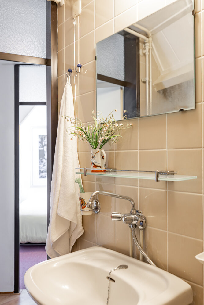 De badkamer (ca. 3 m2) is eenvoudig maar netjes en voorzien van een douche en vaste wastafel.