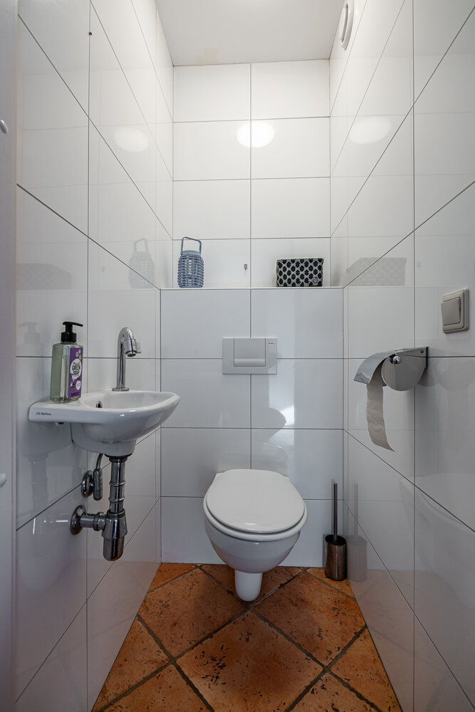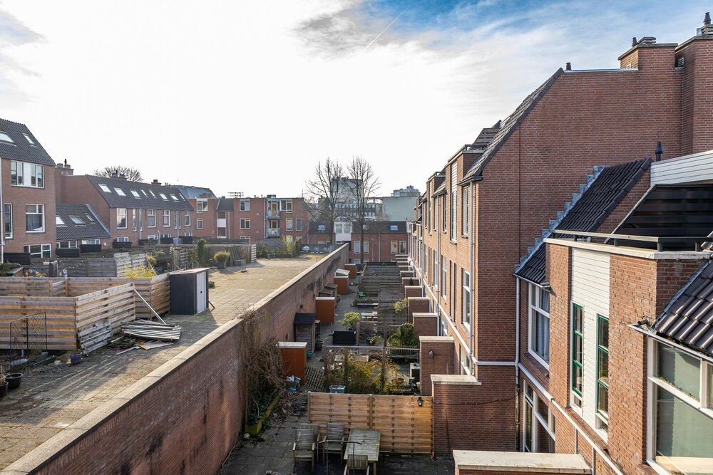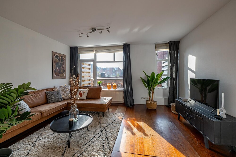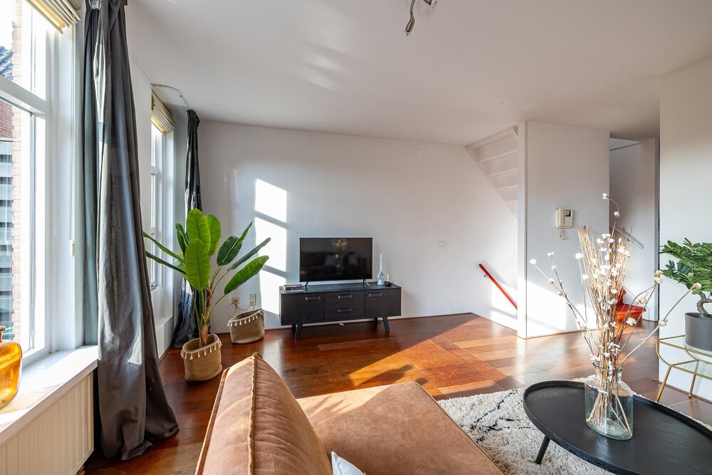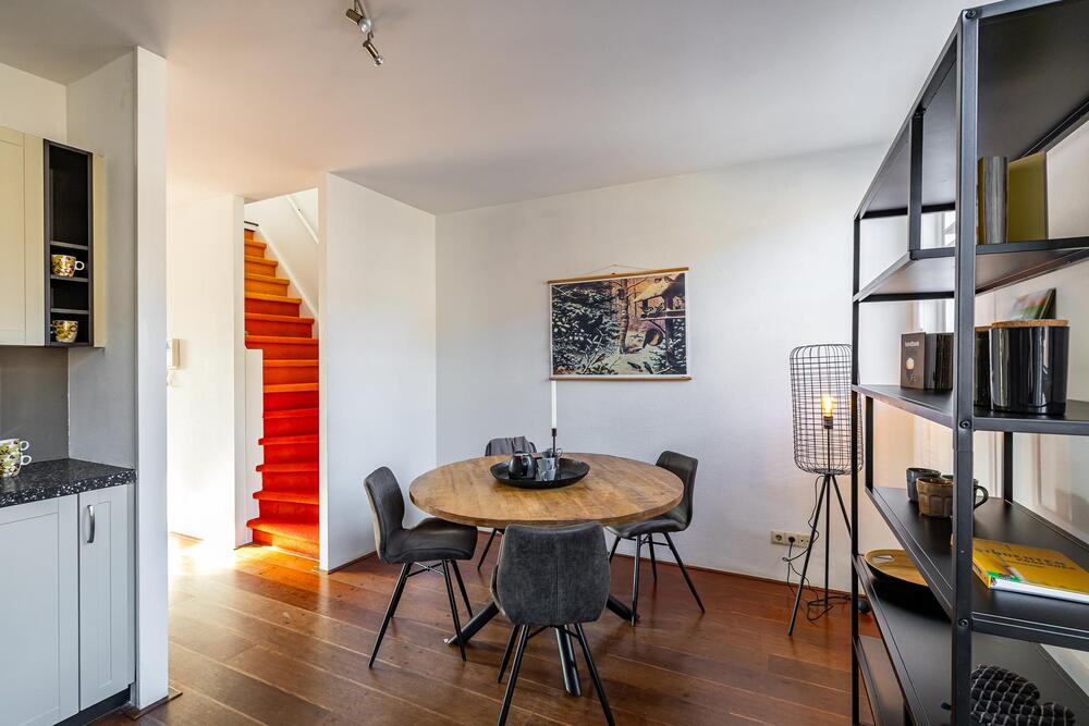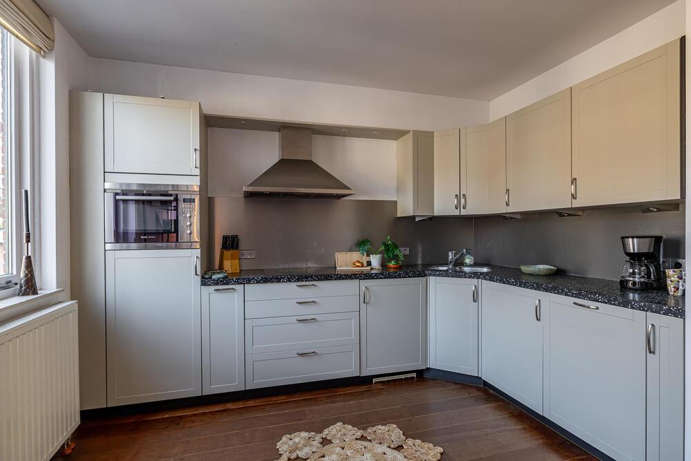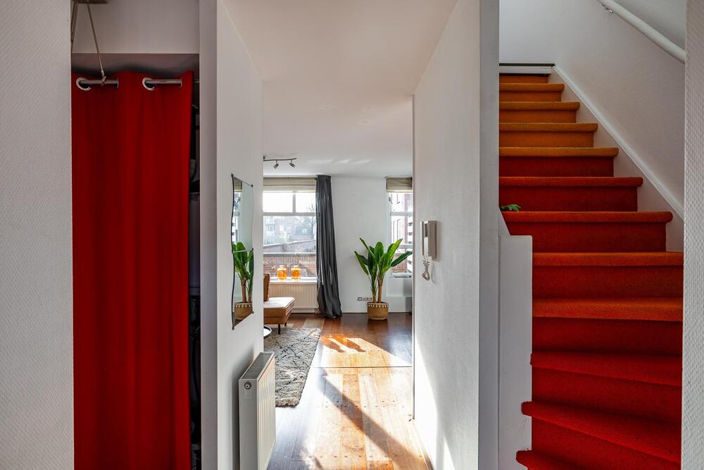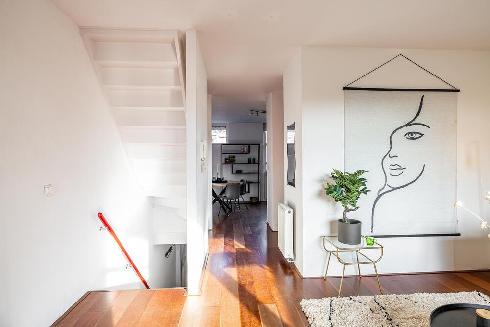 Eerste verdieping: royale living (ca. 42 m2) met aan de voorzijde het zitgedeelte met dakterras (georiënteerd op west, dus middag- en avondzon, 12 m2) en doorloop naar een tussenhal (met toilet en cv-opstelling) en aan de achterzijde de woonkeuken. Deze is voorzien van inbouwapparatuur en meer dan voldoende opbergruimte.