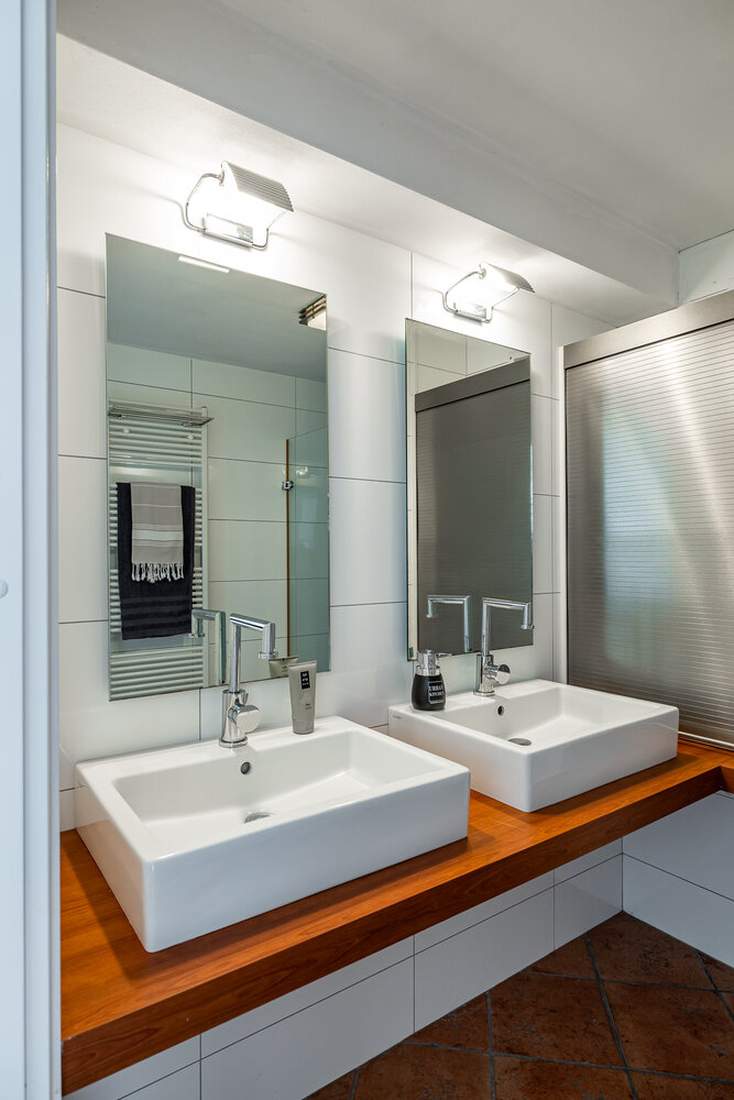 Tweede verdieping: overloop met deur naar balkon (4 m2). Twee slaapkamers (15 en 6 m2) en een nette badkamer (ca. 4 m2) met douche en dubbele wastafel.